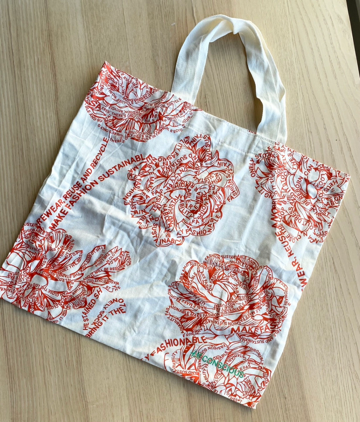 Off-white cotton tote featuring a repeating floral design.