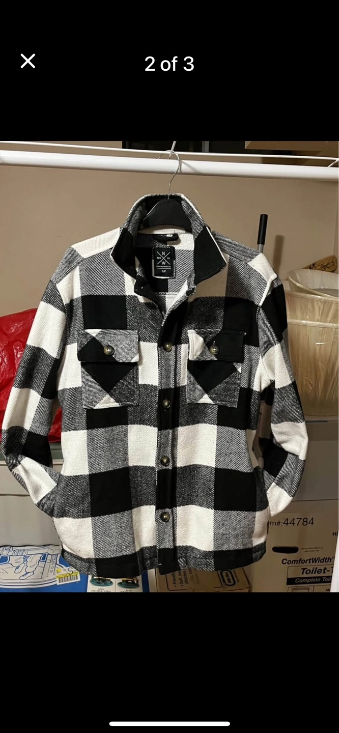 Mens size Small black and white buffalo plaid flannel shirt jacket. Long sleeves, button closure. Soft material, warm and cozy.