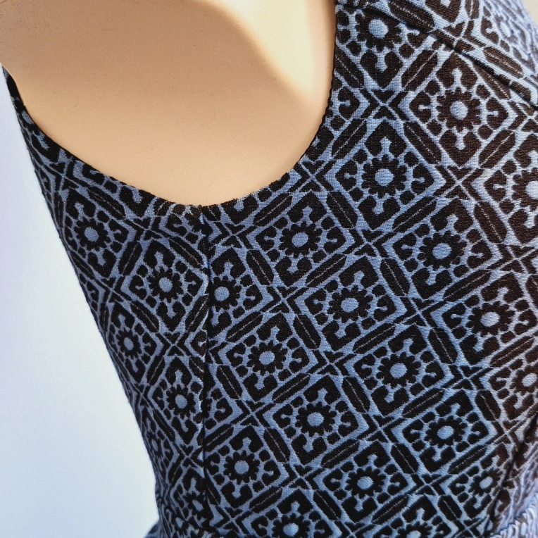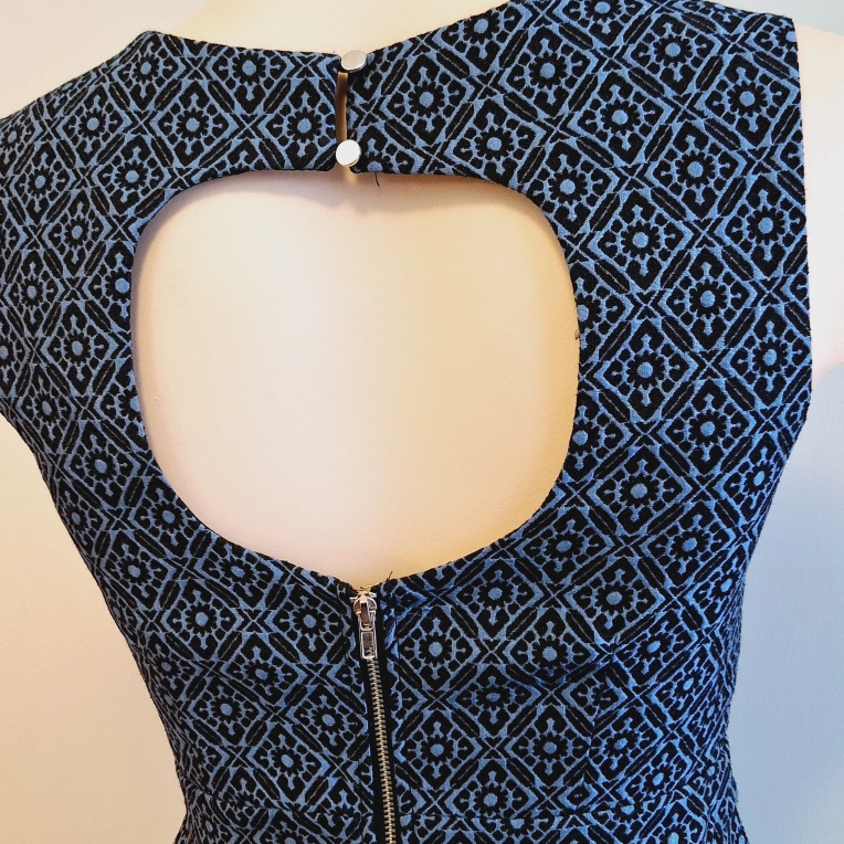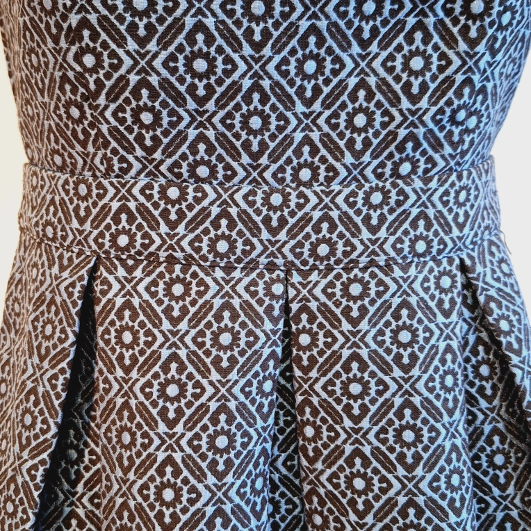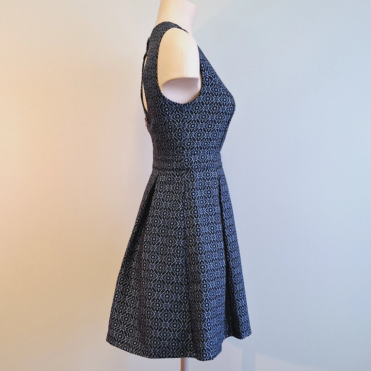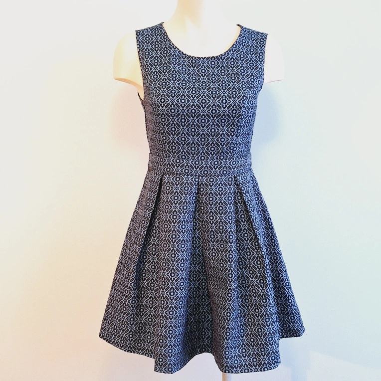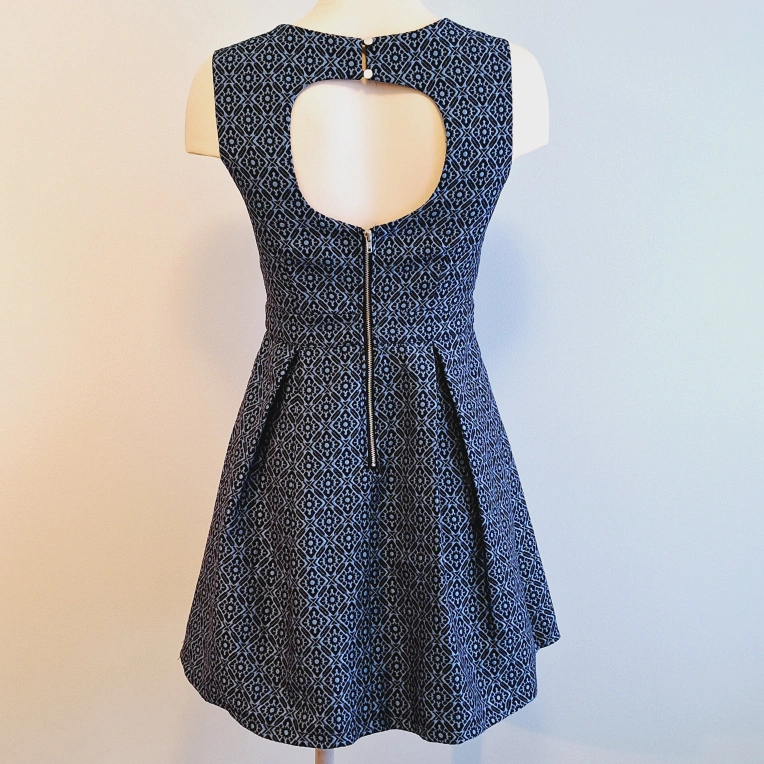A-line sleeveless dress. Features a keyhole back and pleated skirt. Size extra small. Made in China.