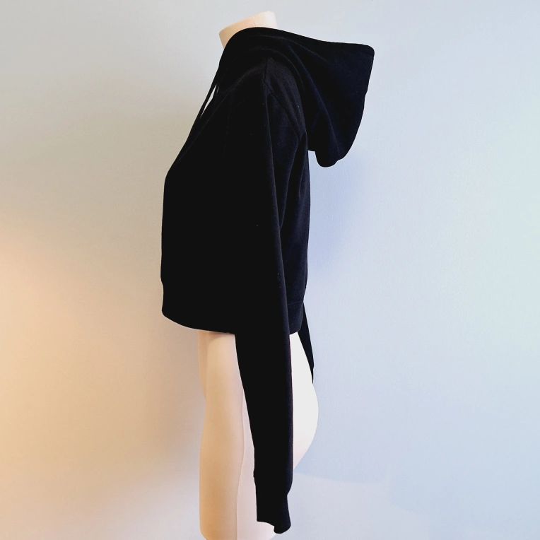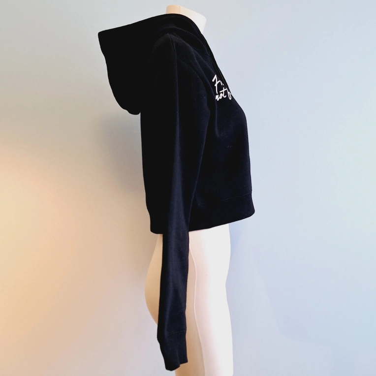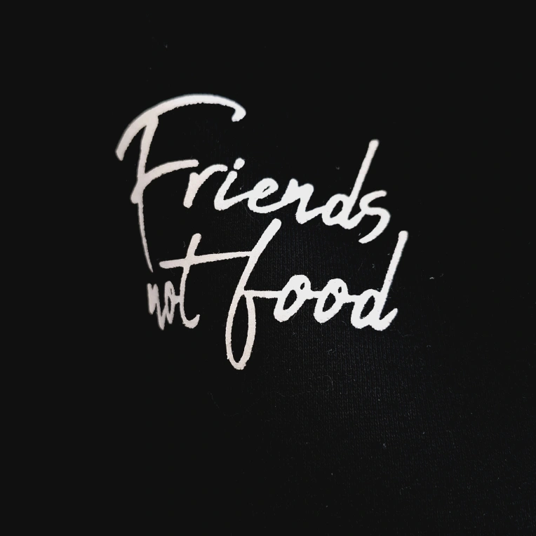 Black cropped hoodie. Long sleeves. Features white cursive lettering: Friends not food. Drawstring hood.