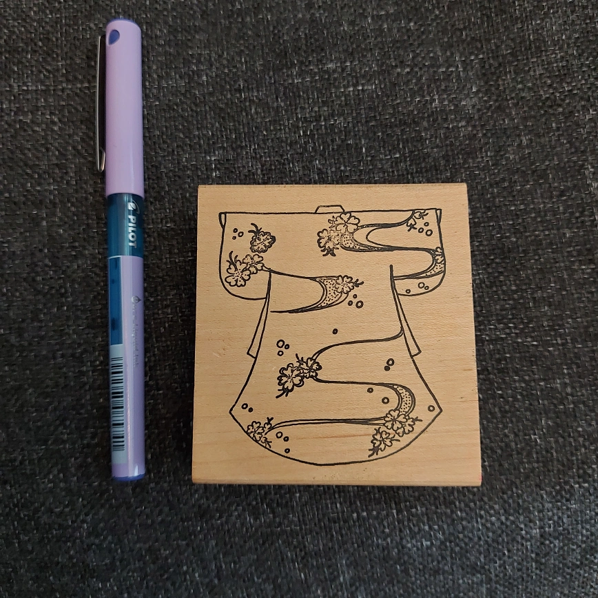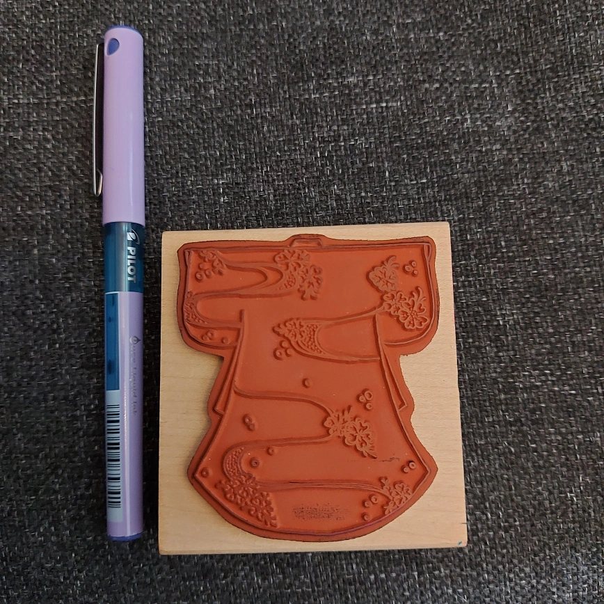Wooden mounted rubber stamp. Used rubber stamp of kimono like top. Pick up at Pape Station. $2 cash or trade for a can of crushed tomatoes.