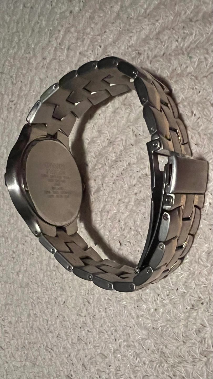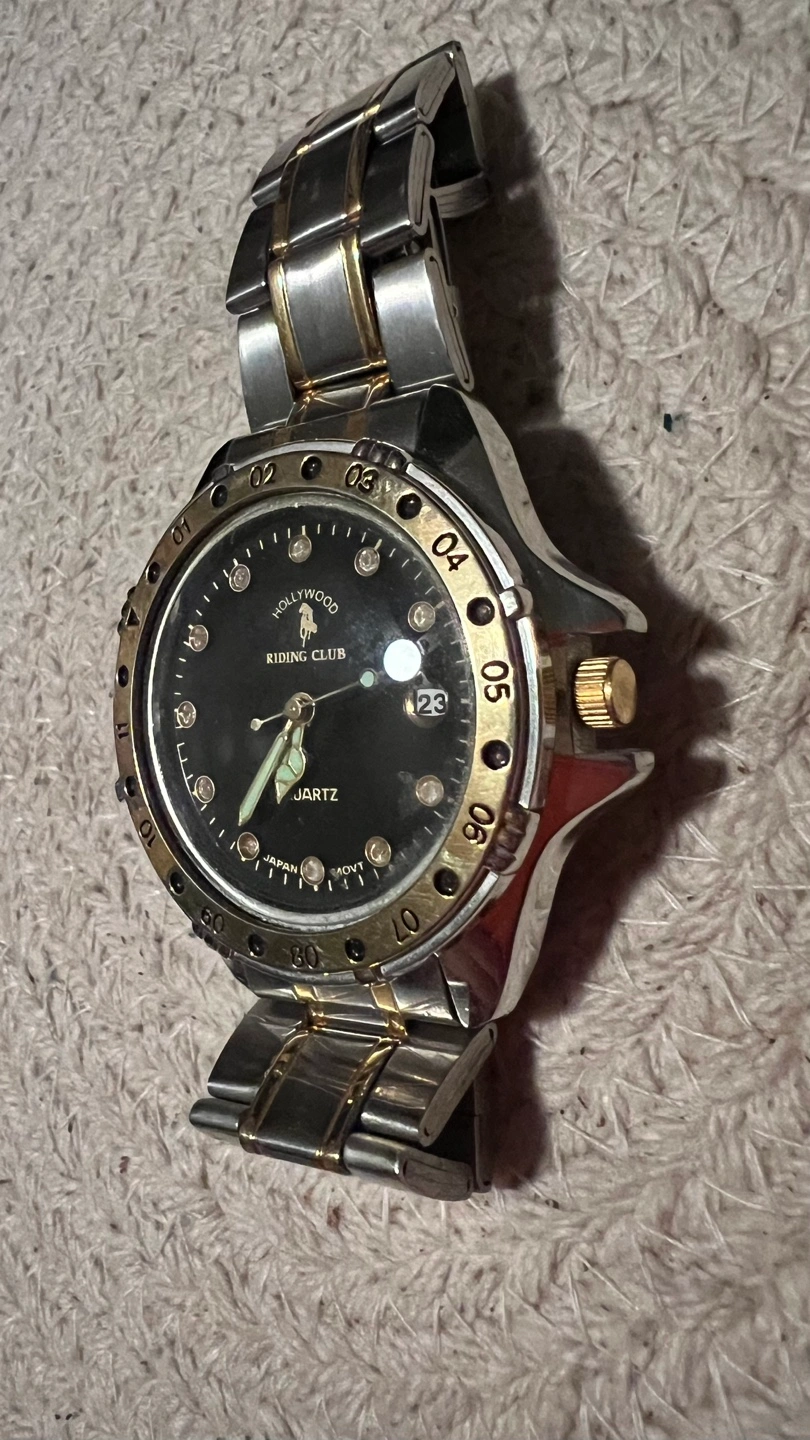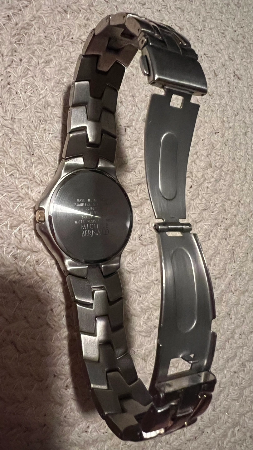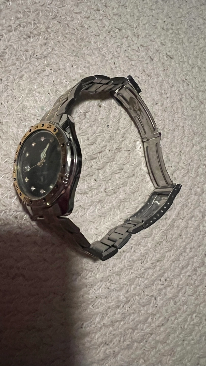 Men's wristwatch. Stainless steel band. Black face. Quartz movement. Water resistant. Pre-owned.