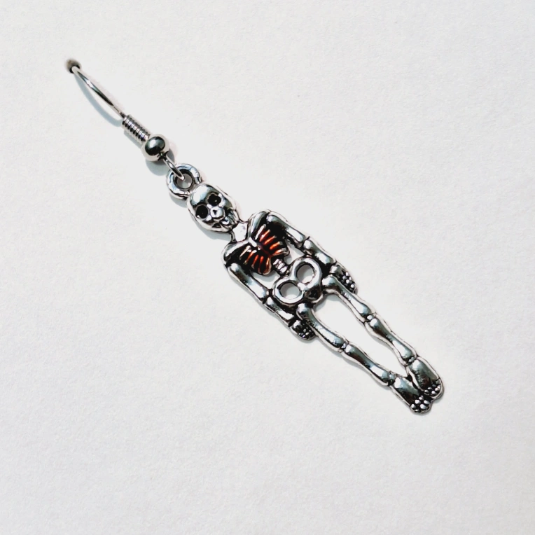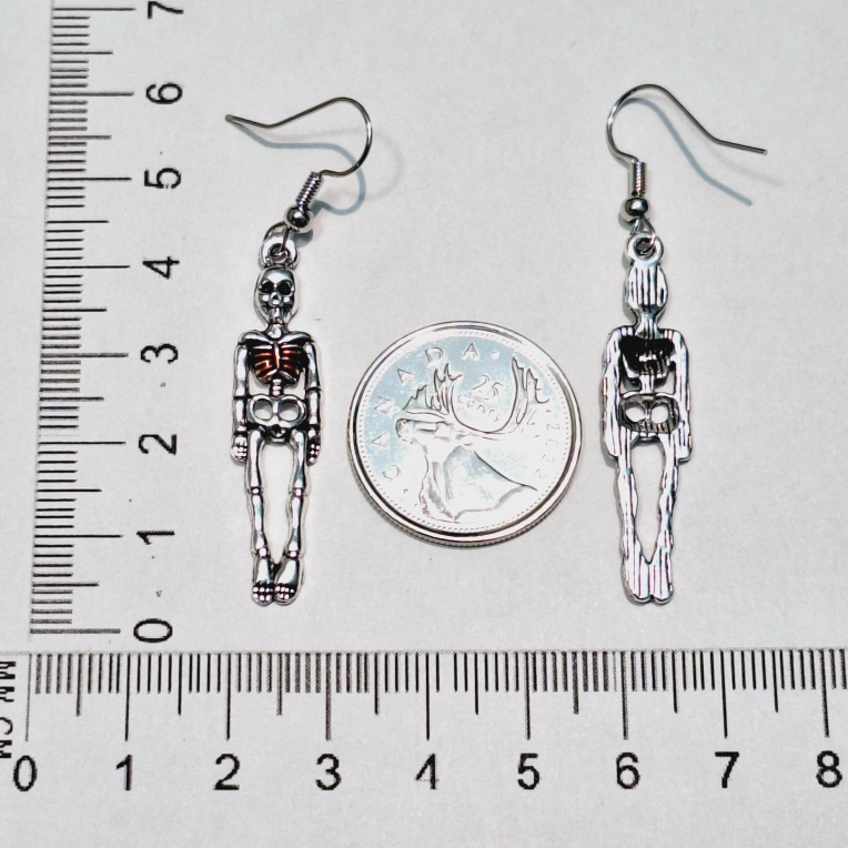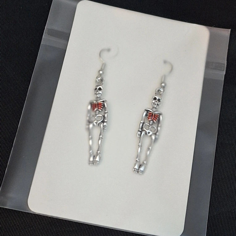 Pair of silver skeleton dangle earrings. Features detailed skeleton design with red accents. Silver-toned metal. Approximately 2 inches long.