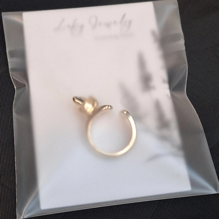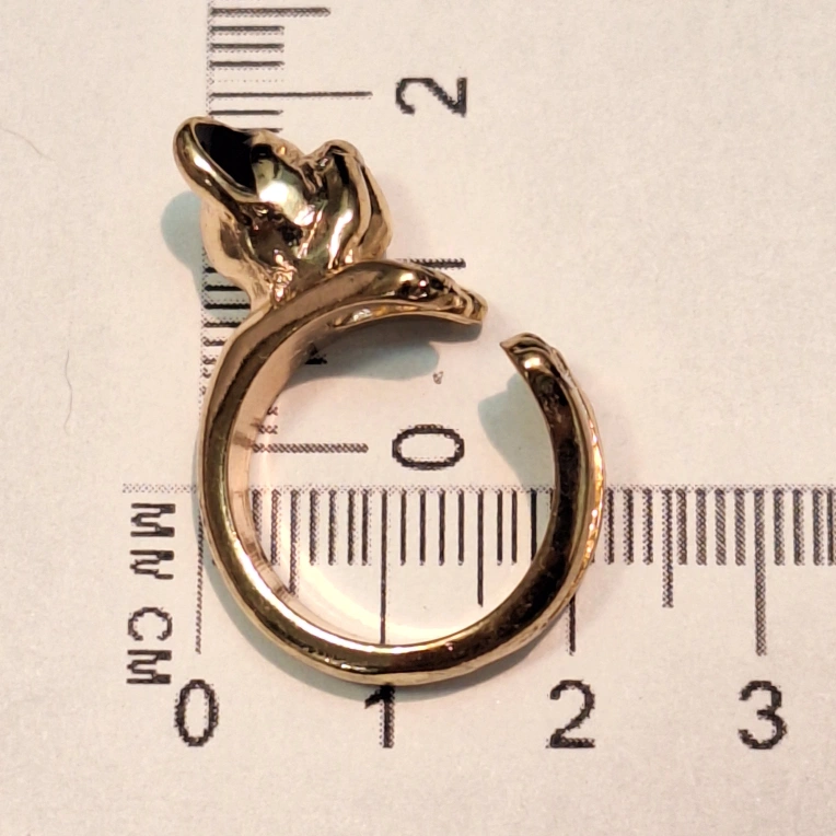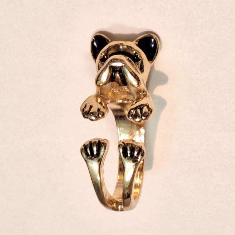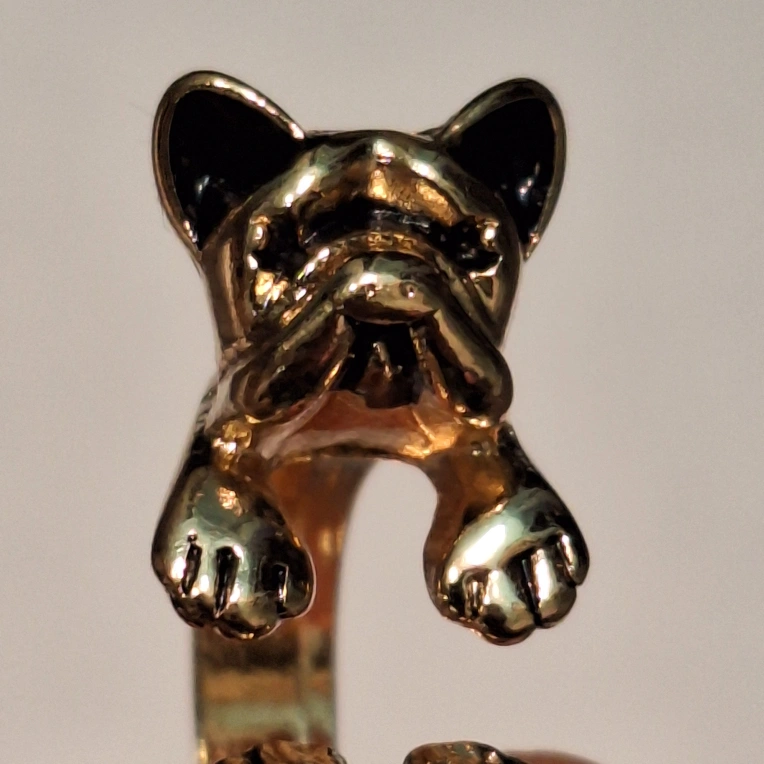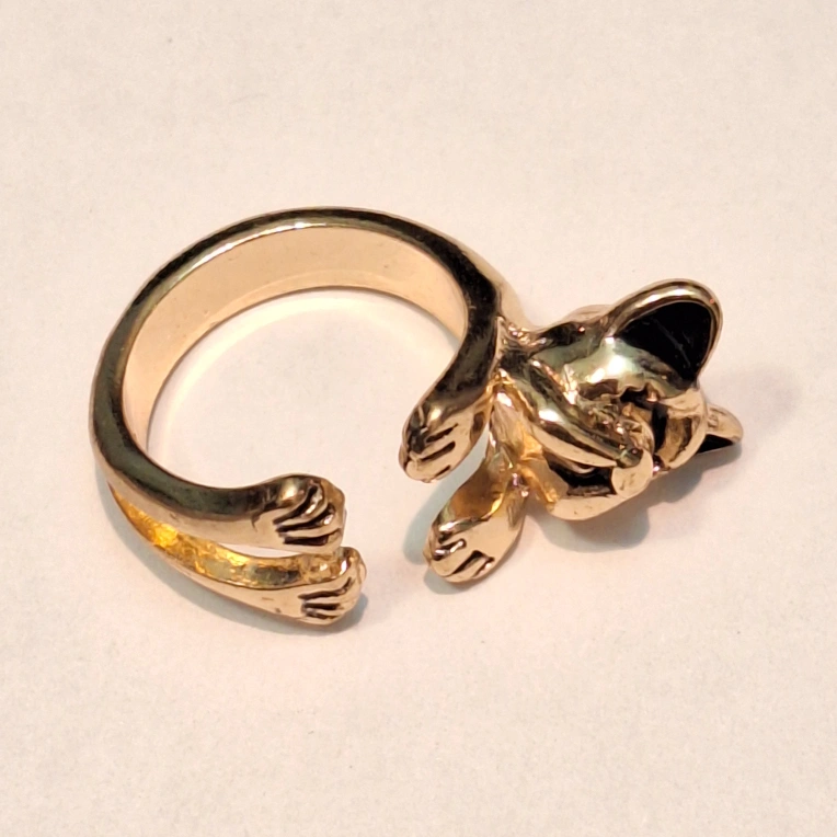 Gold-toned metal ring. Features a French Bulldog design. Adjustable sizing. Unique statement piece.
