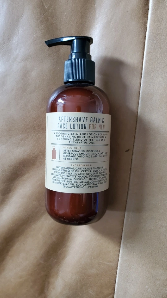 Amber bottle with pump dispenser. Cognac & Cypress scent. Aftershave balm and face lotion for men. Contains tea tree and eucalyptus oils. Soothes skin after shaving.