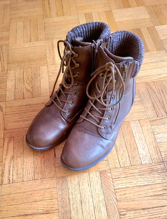 Women's brown faux leather ankle boots. Lace-up closure and side zipper. Knit cuff detail. Good for fall and winter.