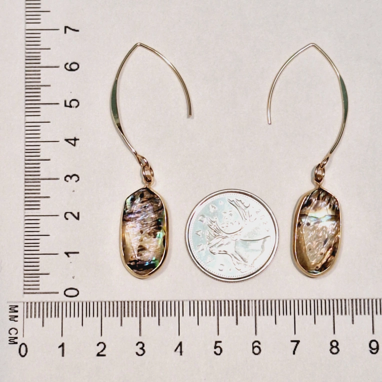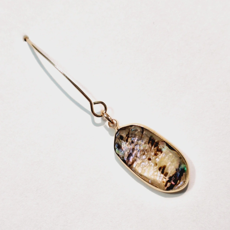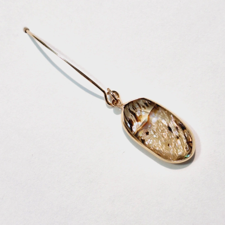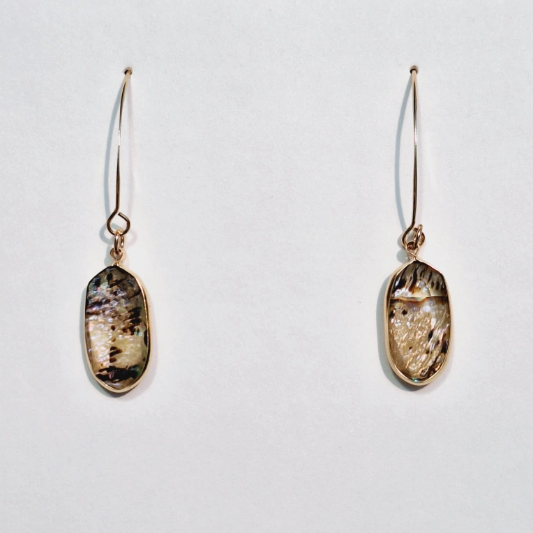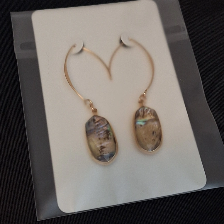 Beautiful pair of dangle earrings. Features oval-shaped mother of pearl stones. Gold-tone metal. Lightweight and comfortable to wear. Perfect for adding a touch of elegance to any outfit.
