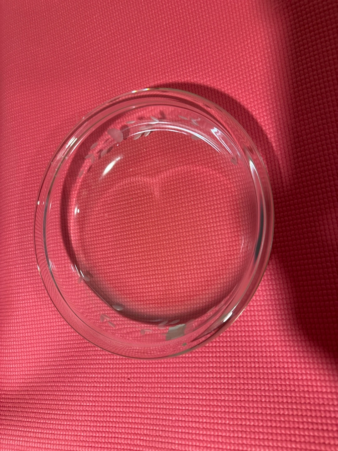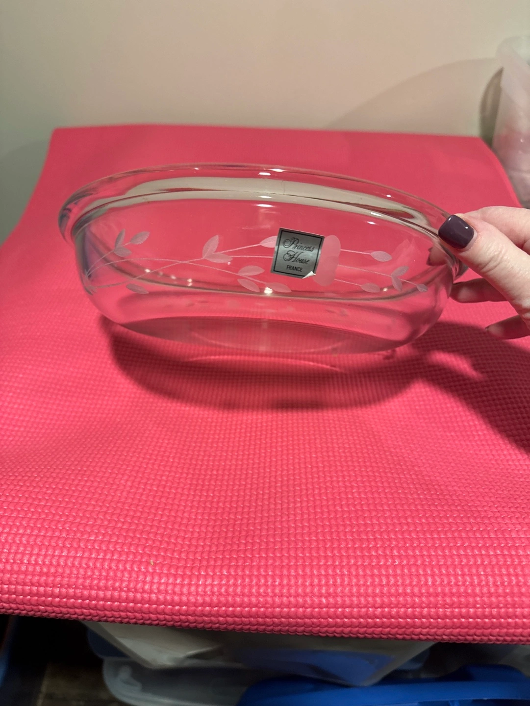 Elegant glass baking dish. Features a lovely etched floral pattern. Perfect for serving or baking. Made in France.