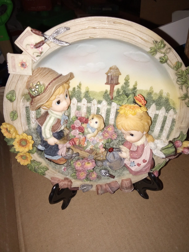 Beautiful collectible plate. Features two children gardening. Intricate details. Comes with stand. Perfect for collectors or home decor.