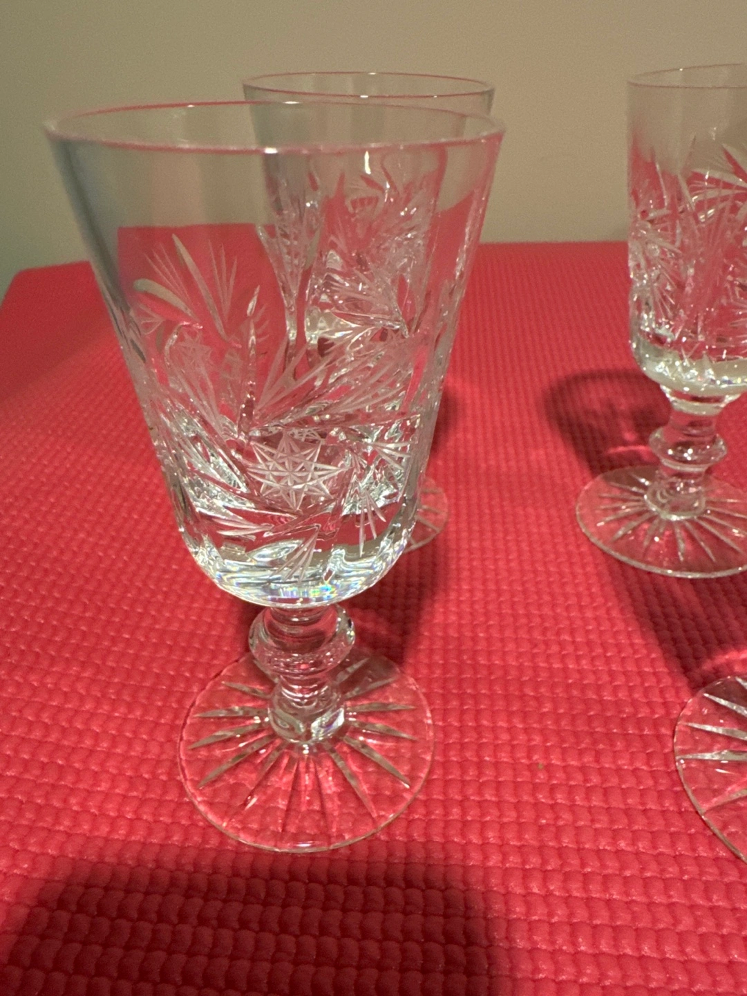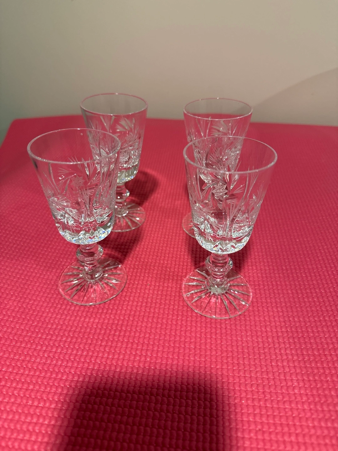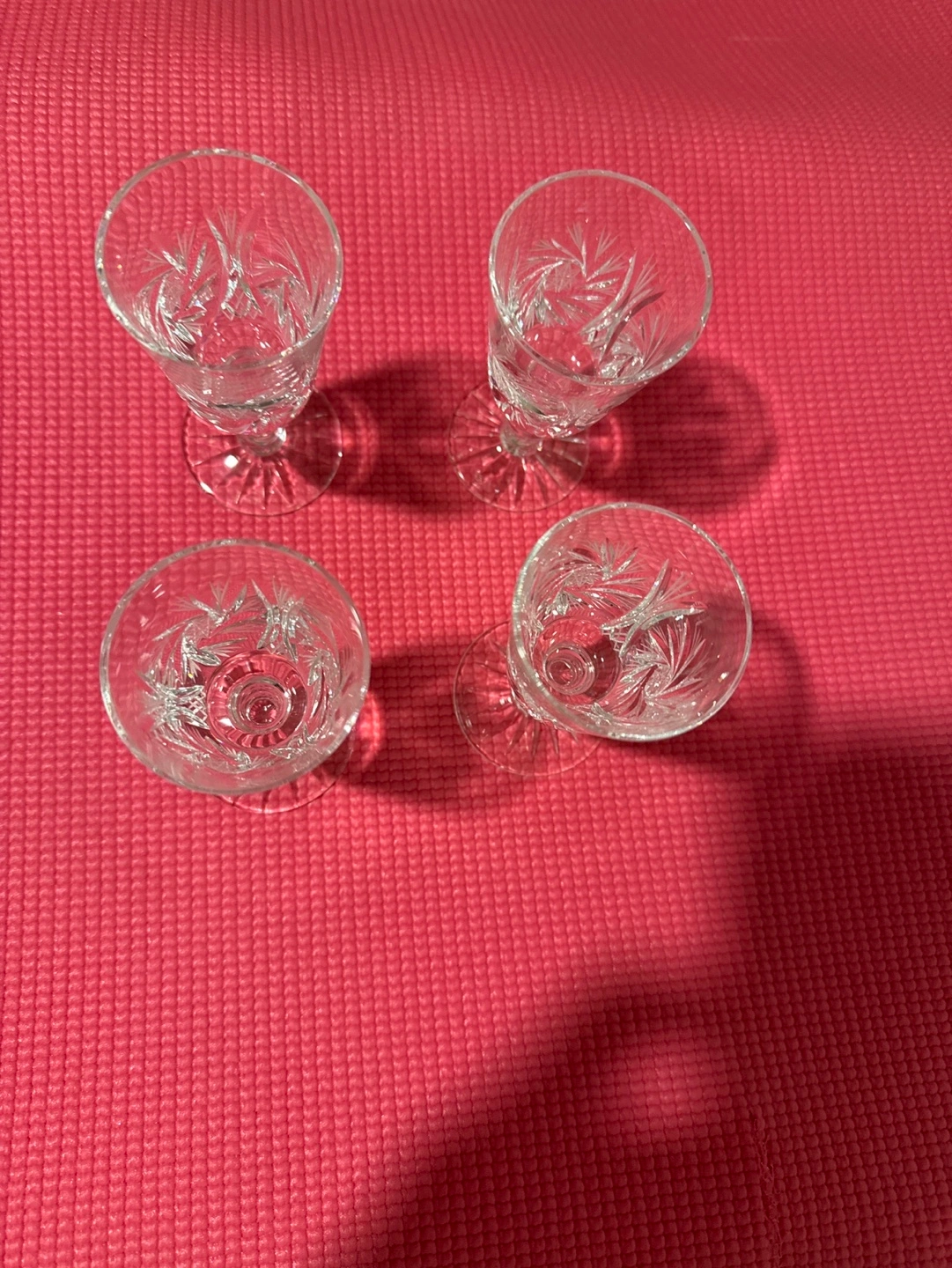 Four beautiful Pinwheel crystal sherry glasses. Etched detail. Elegant design. Perfect for entertaining. Never used. Over 40 years old.