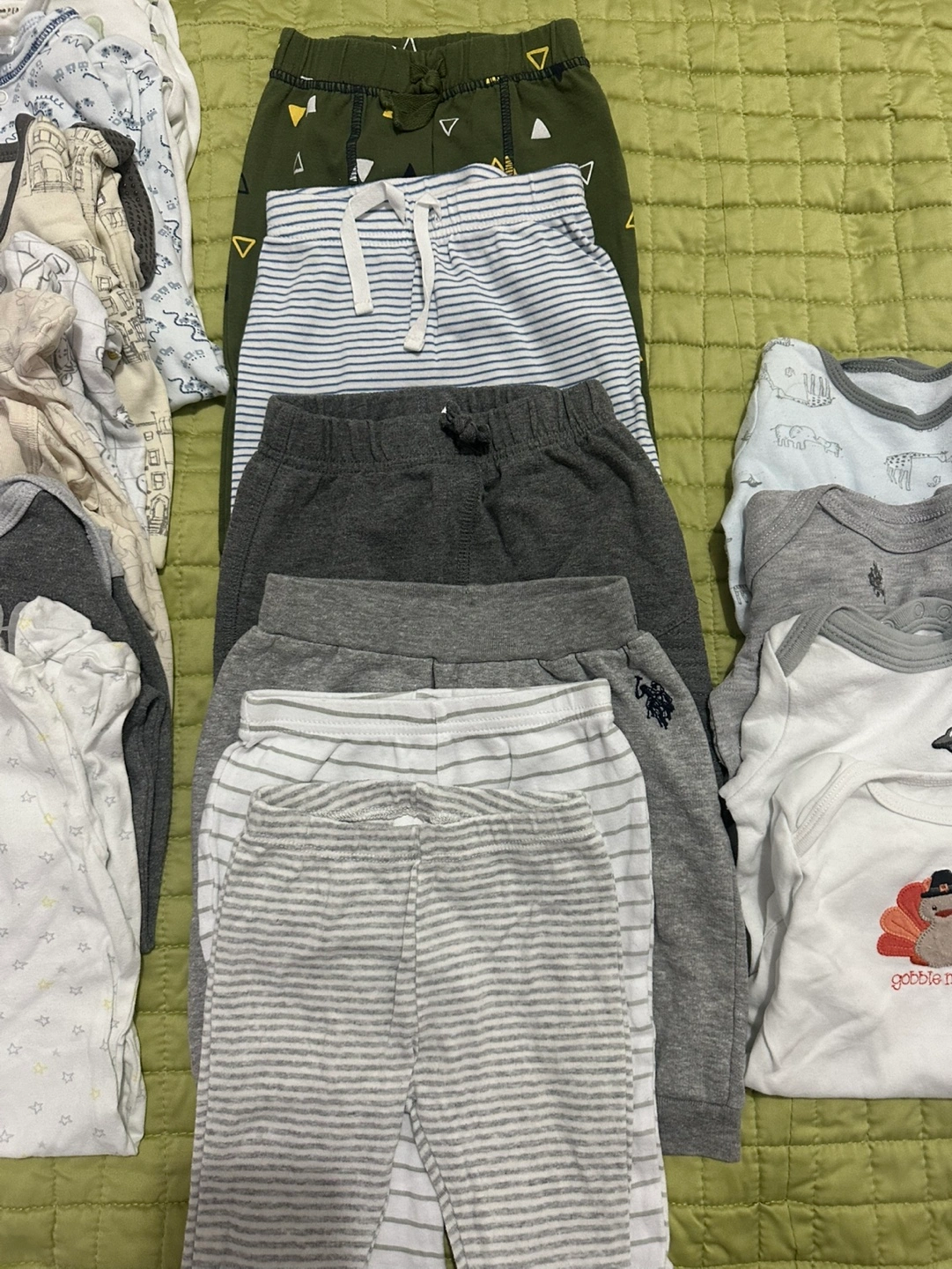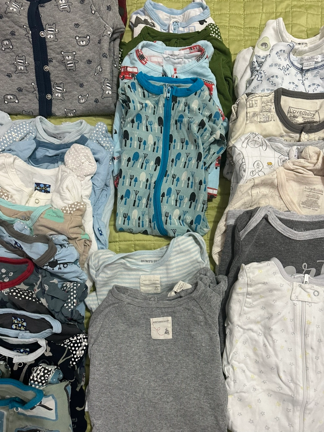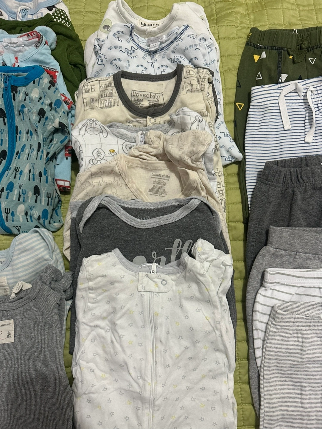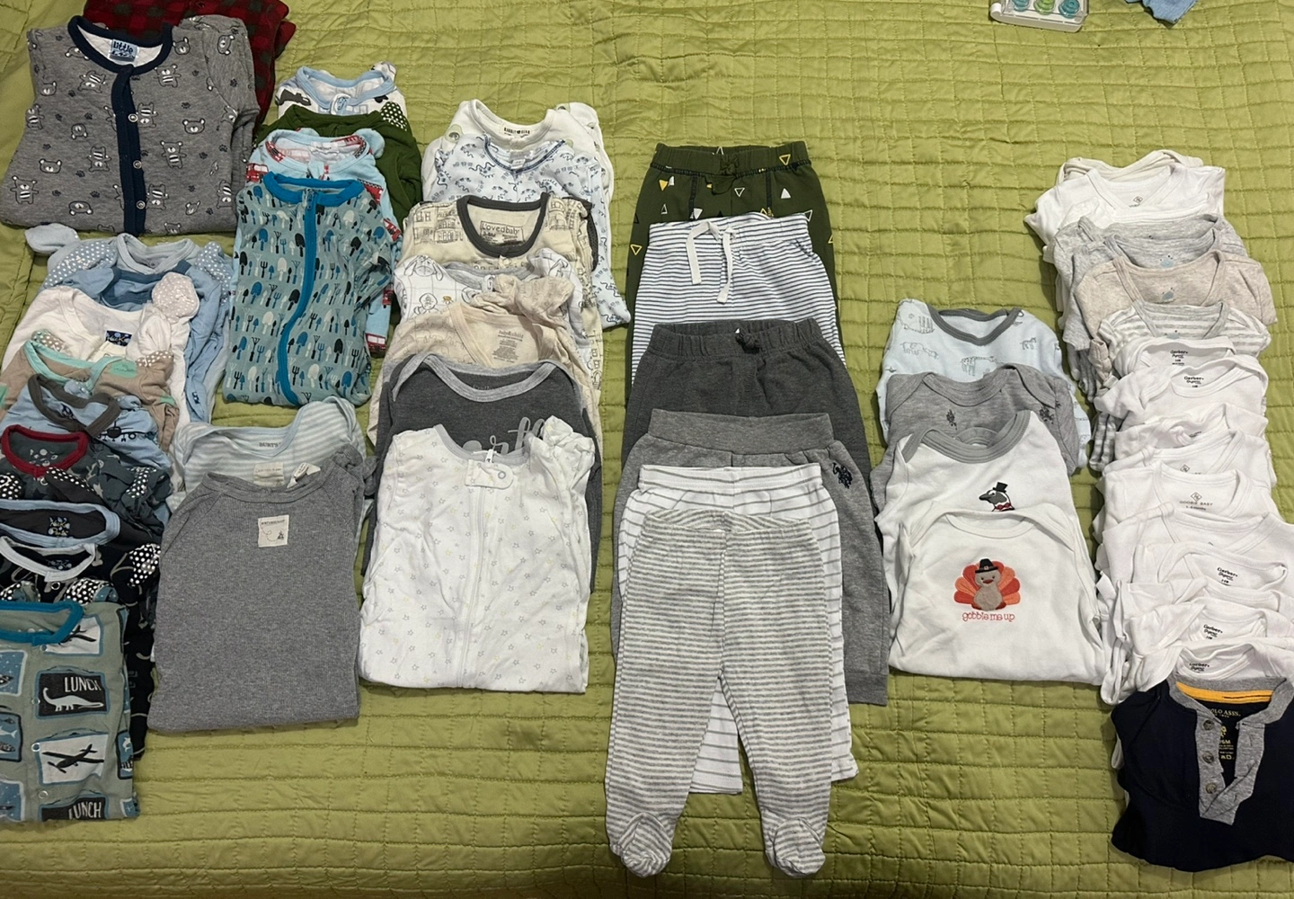 Large bundle of baby clothes. Includes bodysuits, sleepers, and pants. Various colours and patterns. Sizes 3-6 months. Good used condition.
