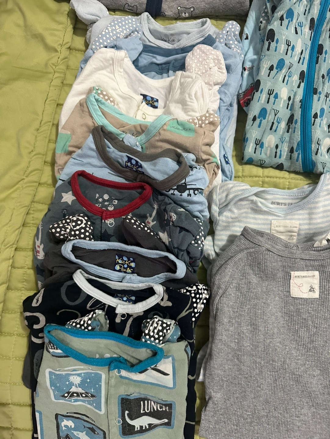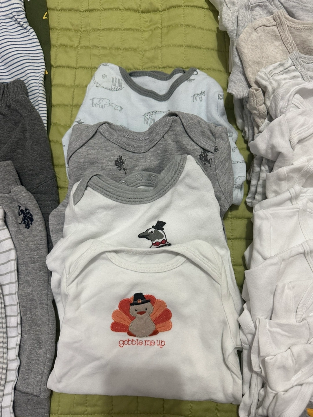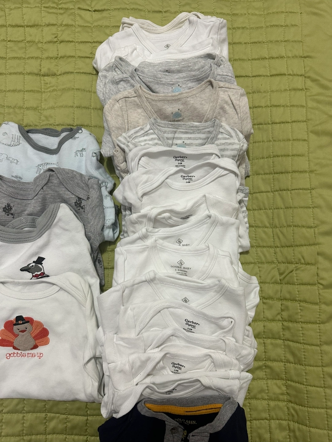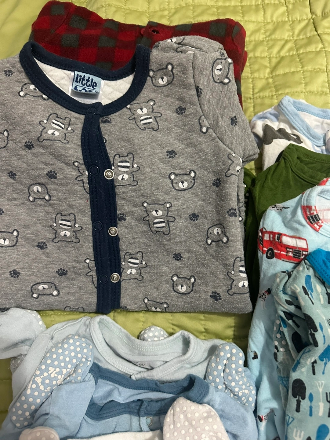 Large bundle of baby clothes. Includes bodysuits, sleepers, and pants. Various colours and patterns. Sizes 3-6 months. Good used condition.