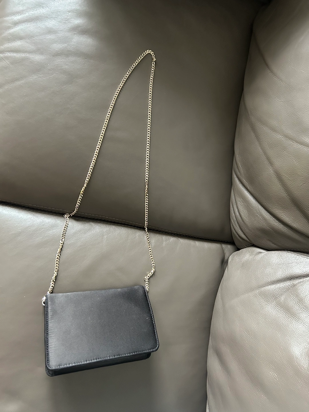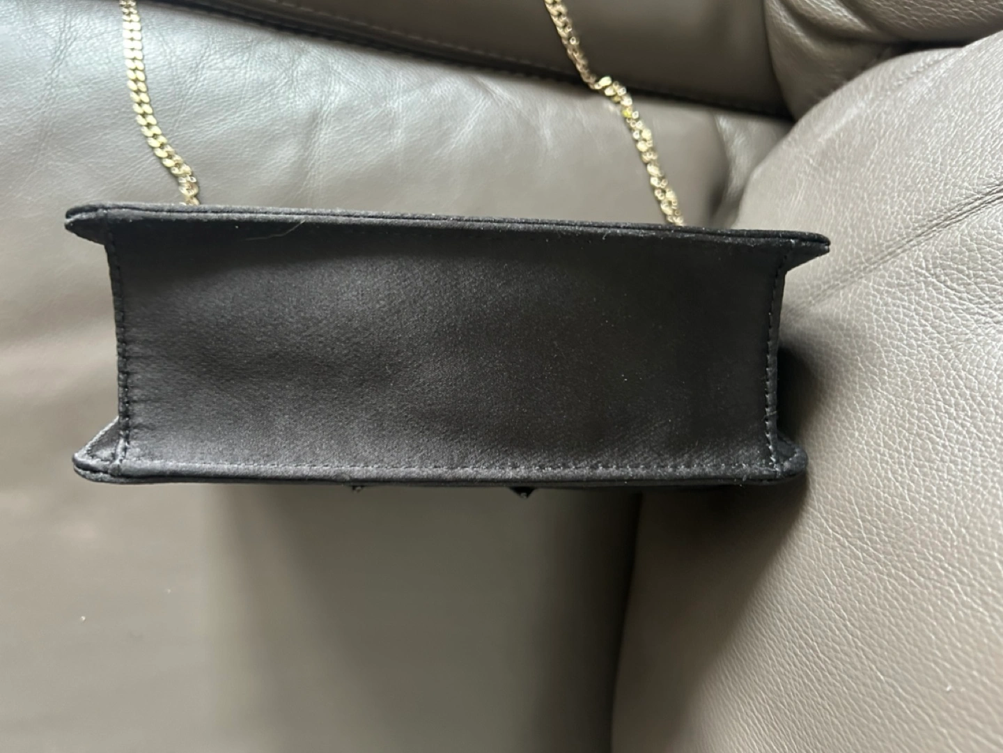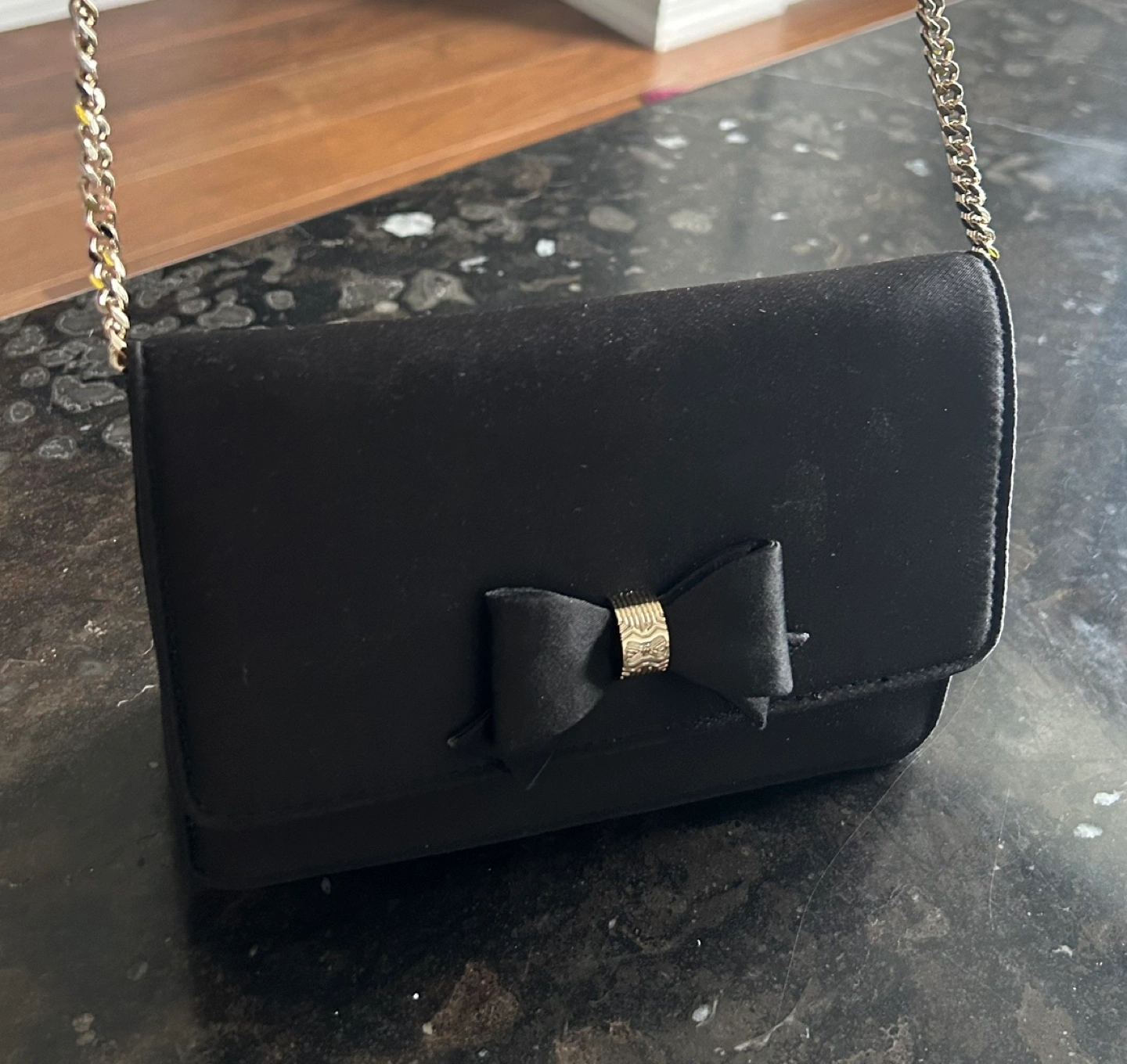 Ted Baker elegant black satin bag. Features a long gold chain strap and a delicate bow accent. Small and compact, perfect for evenings out and special occasions. Includes a small interior mirror. See receipt in pictures for authenticity, purchased at Ted baker Eaton Centre for $140. Worn twice, like new. Unattached tag and bag included.