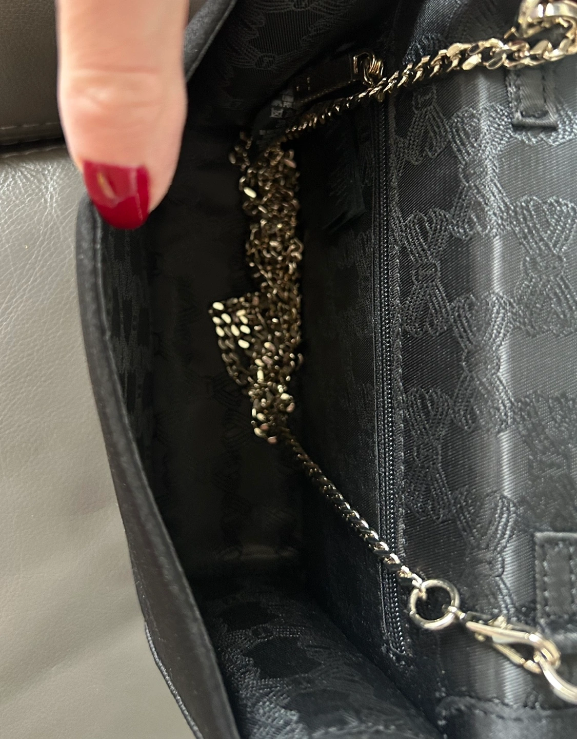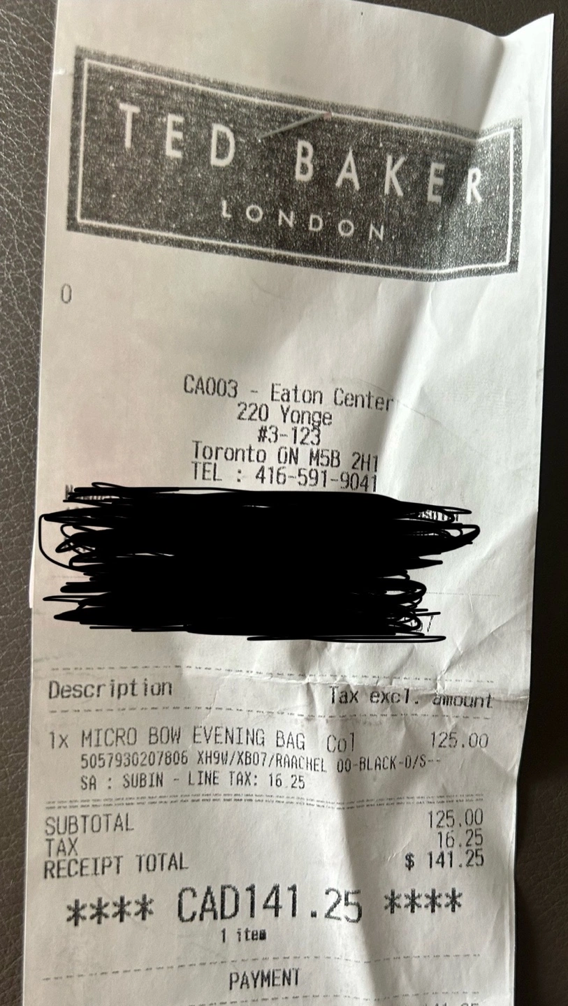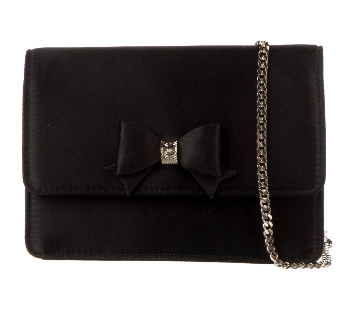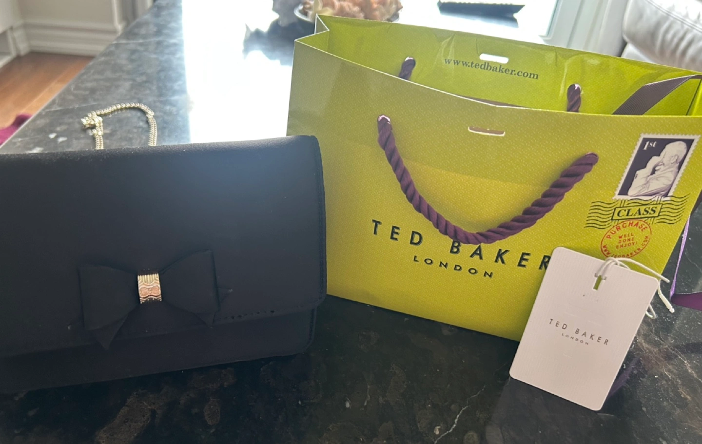 Ted Baker elegant black satin bag. Features a long gold chain strap and a delicate bow accent. Small and compact, perfect for evenings out and special occasions. Includes a small interior mirror. See receipt in pictures for authenticity, purchased at Ted baker Eaton Centre for $140. Worn twice, like new. Unattached tag and bag included.