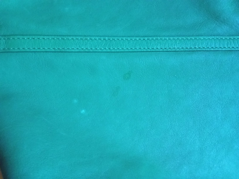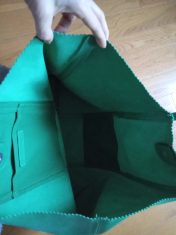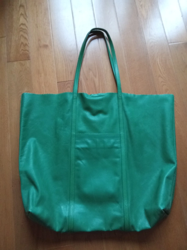 Large green leather tote bag. Features two shoulder straps and a small interior pocket. Scalloped edge detail. Minor blemish on the back side asseen in photo. Good for everyday use.