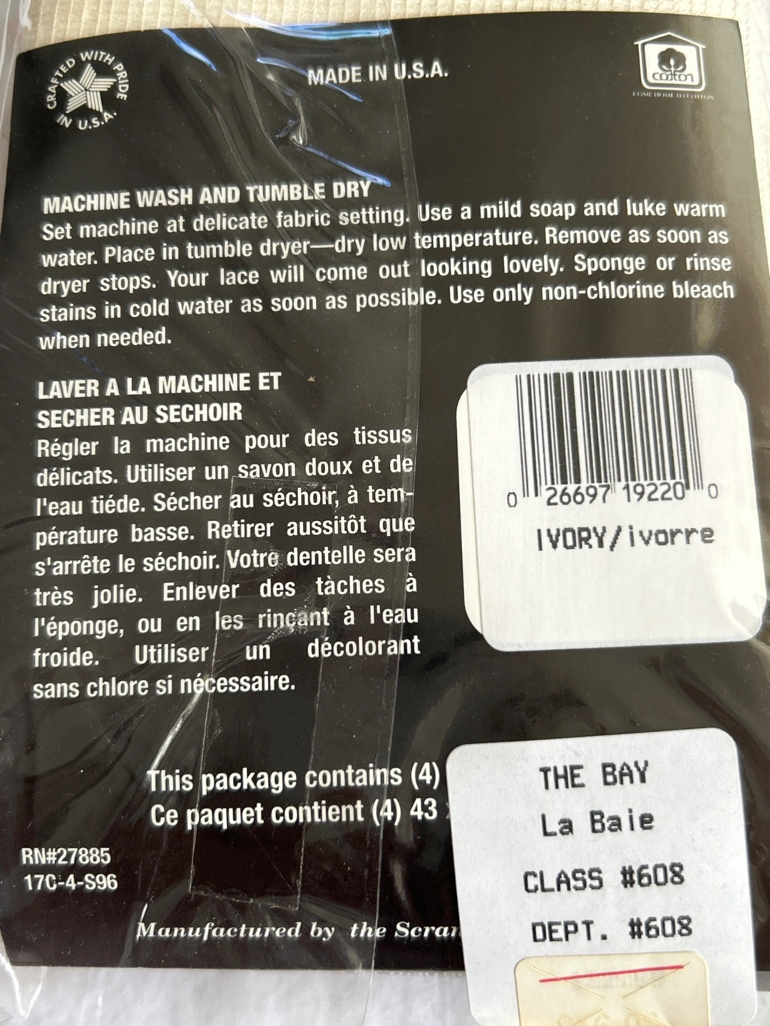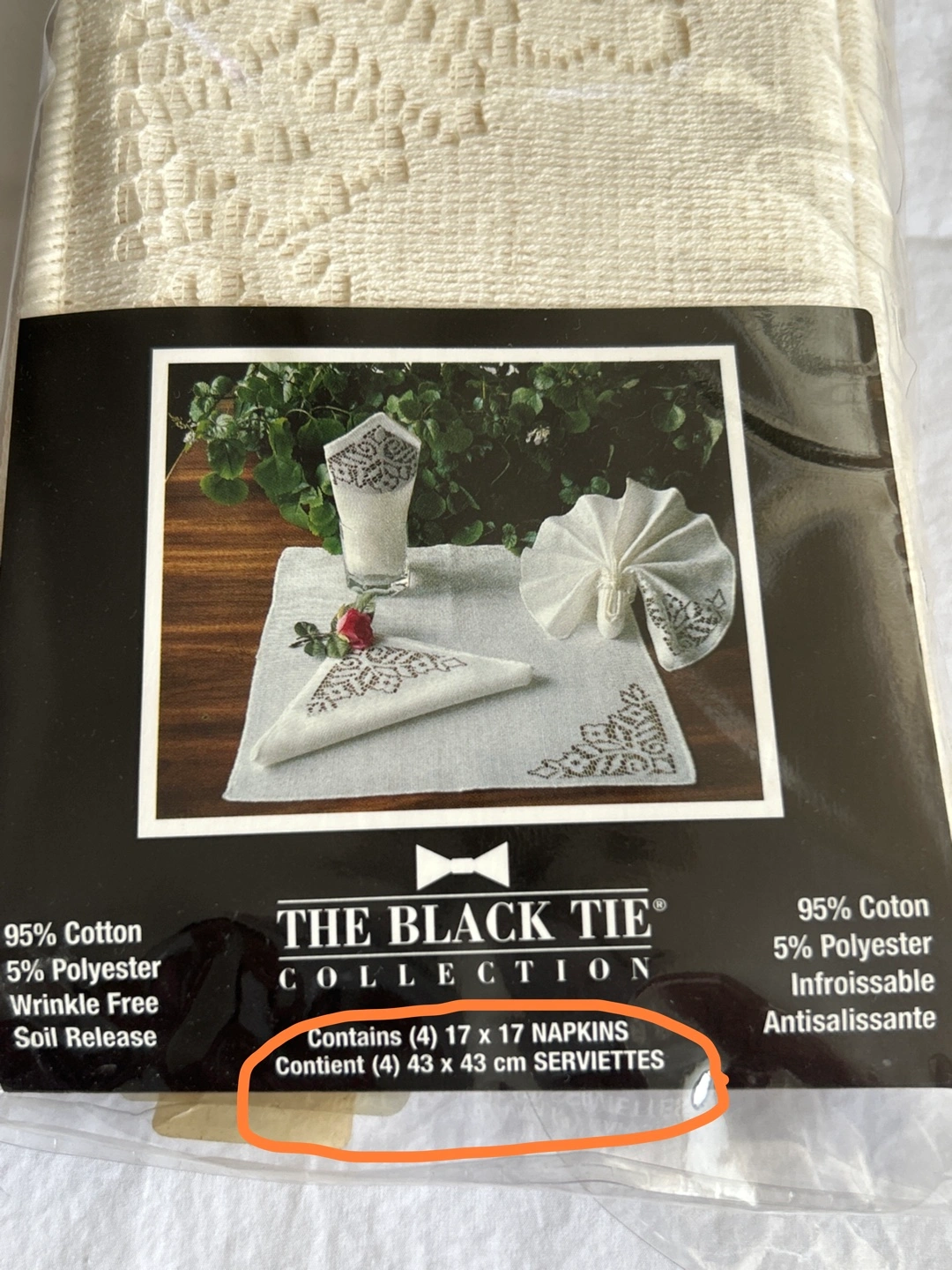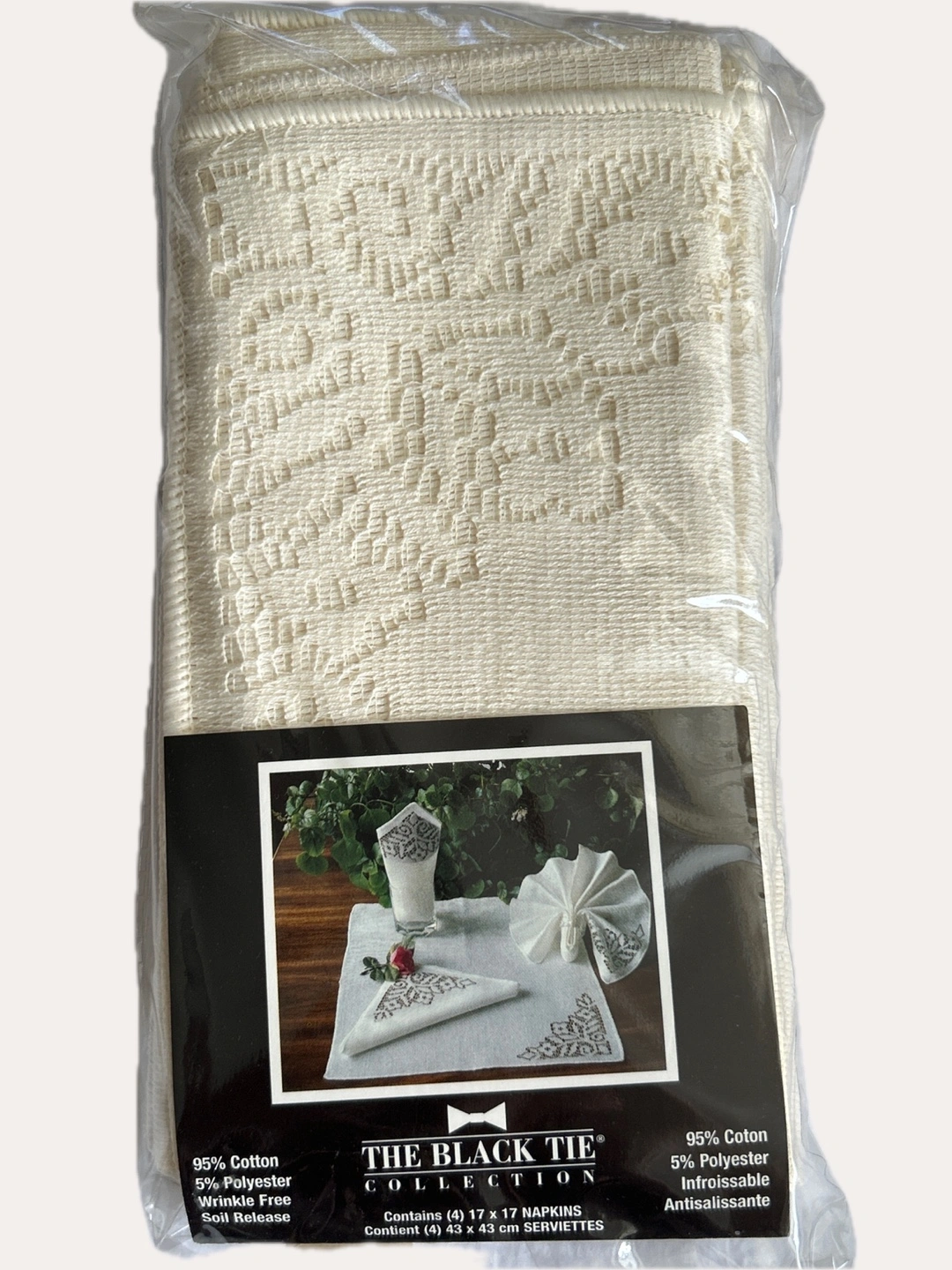 The Black Tie Collection. Set of four ivory coloured table napkins. 95% cotton, 5% polyester. With lace design. Wrinkle-free and soil release. Machine washable and dryable.