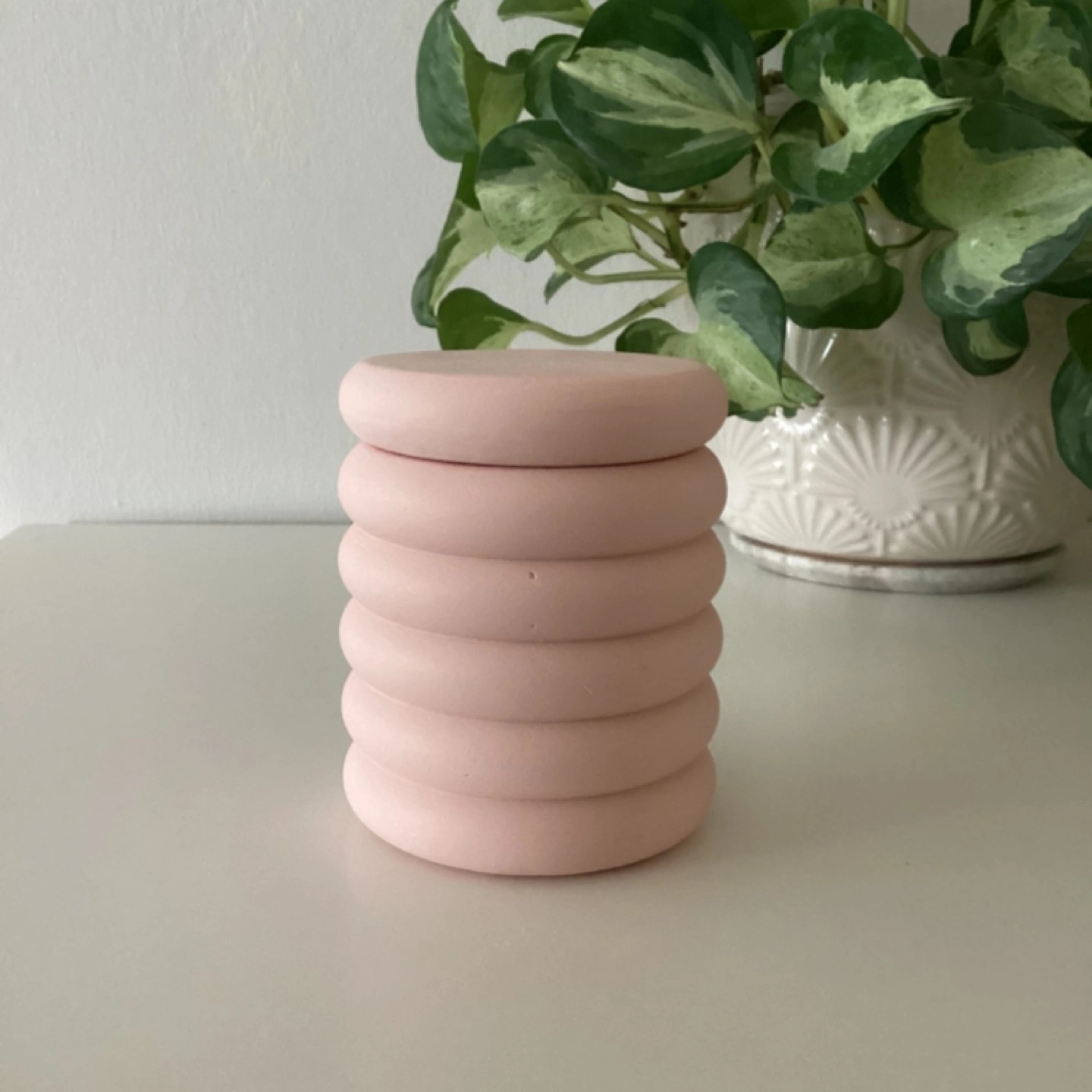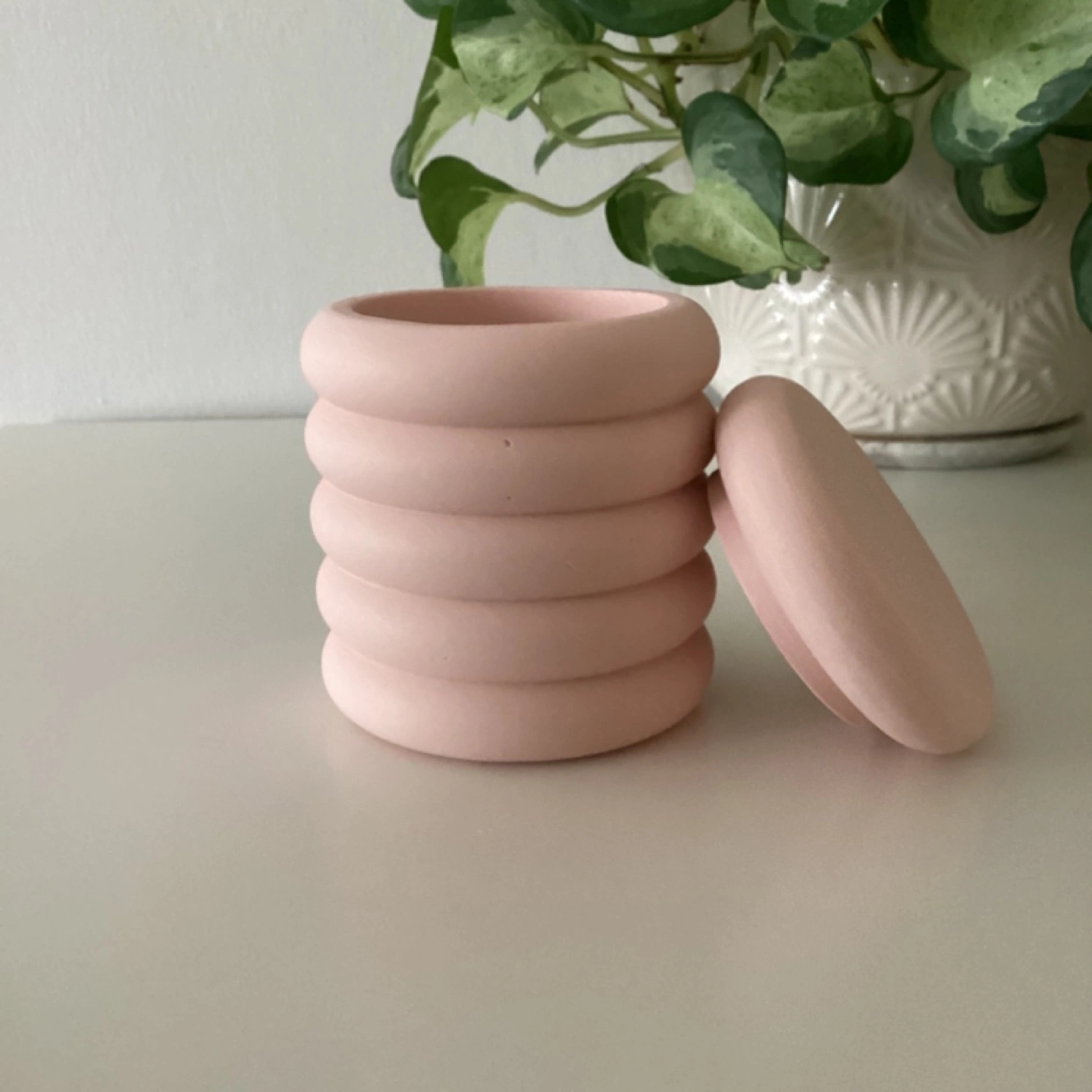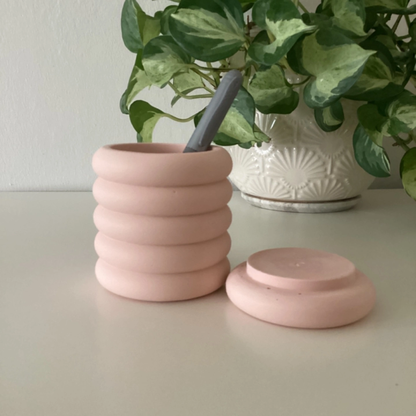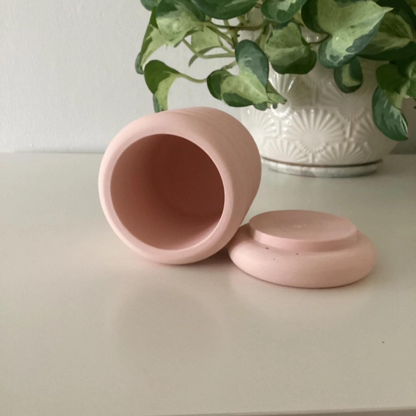 Adorable pink Jesmonite container, perfect for storing small items on a desk or vanity, for your make up brushes or whatever you wish to put in it! Features a unique ribbed design and matching lid. Measures 3β diameter and 3.5β tall.
