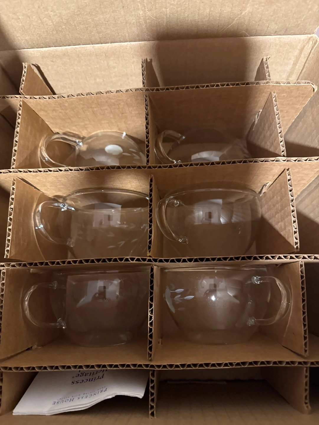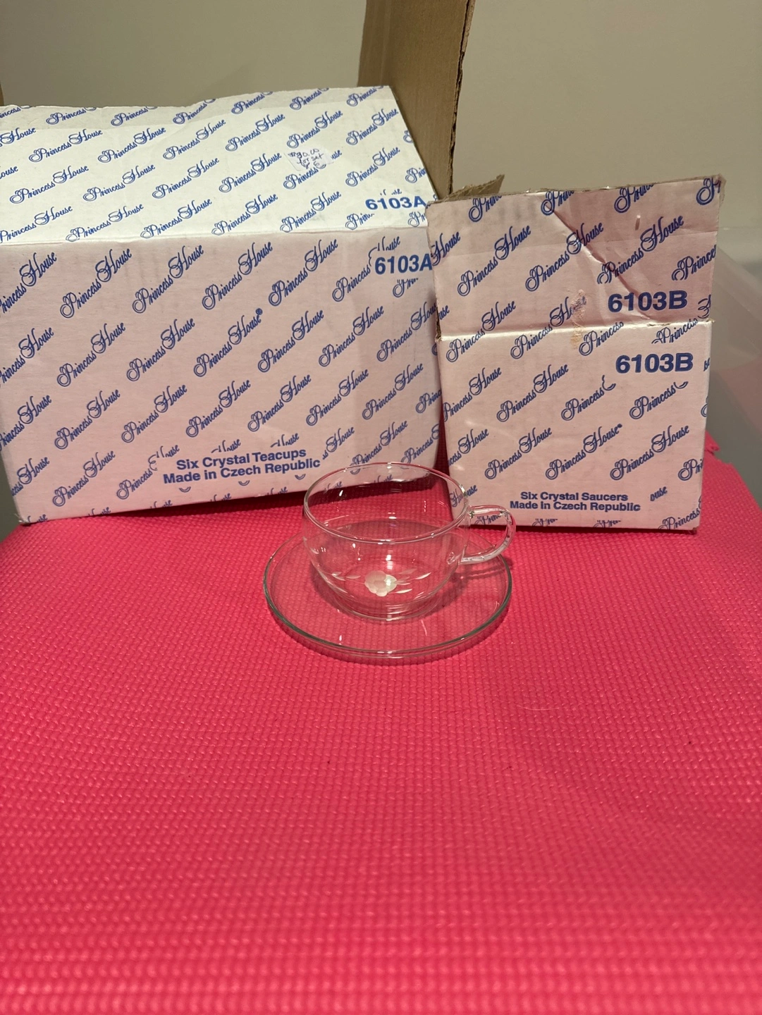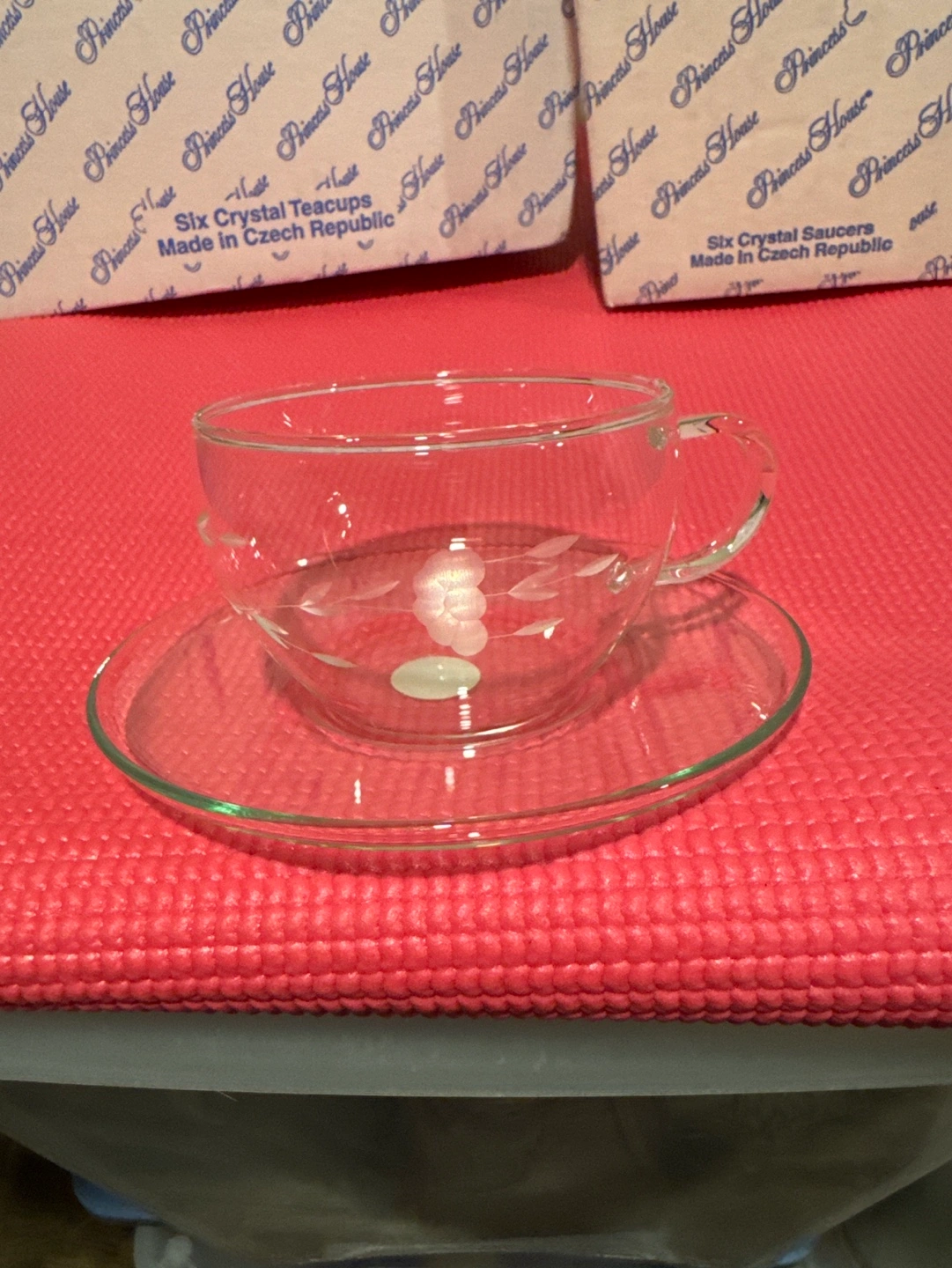Handblown glass teacup and saucer set of 6. Etched floral design. Made in Czech Republic. Very elegant.