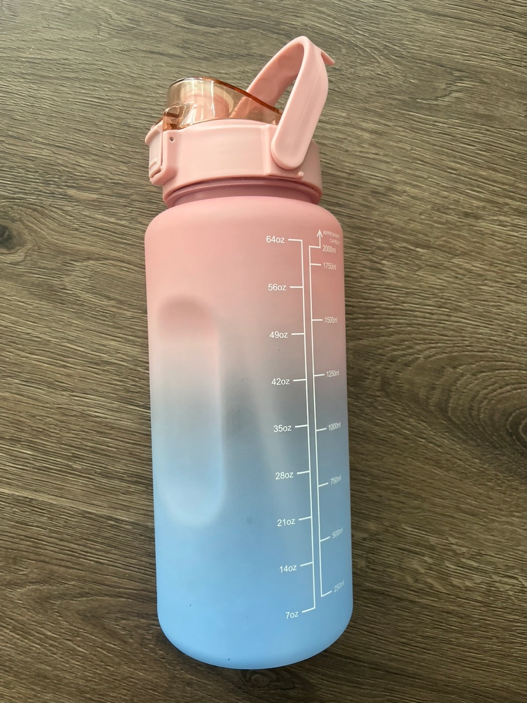 Large capacity water bottle. Pink and blue ombre design. Flip-top lid. Motivational quotes and time markers. Great for hydration. Comes with none used extra straw .