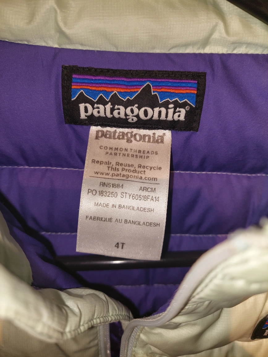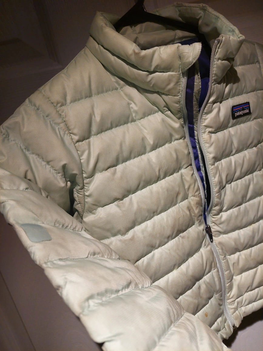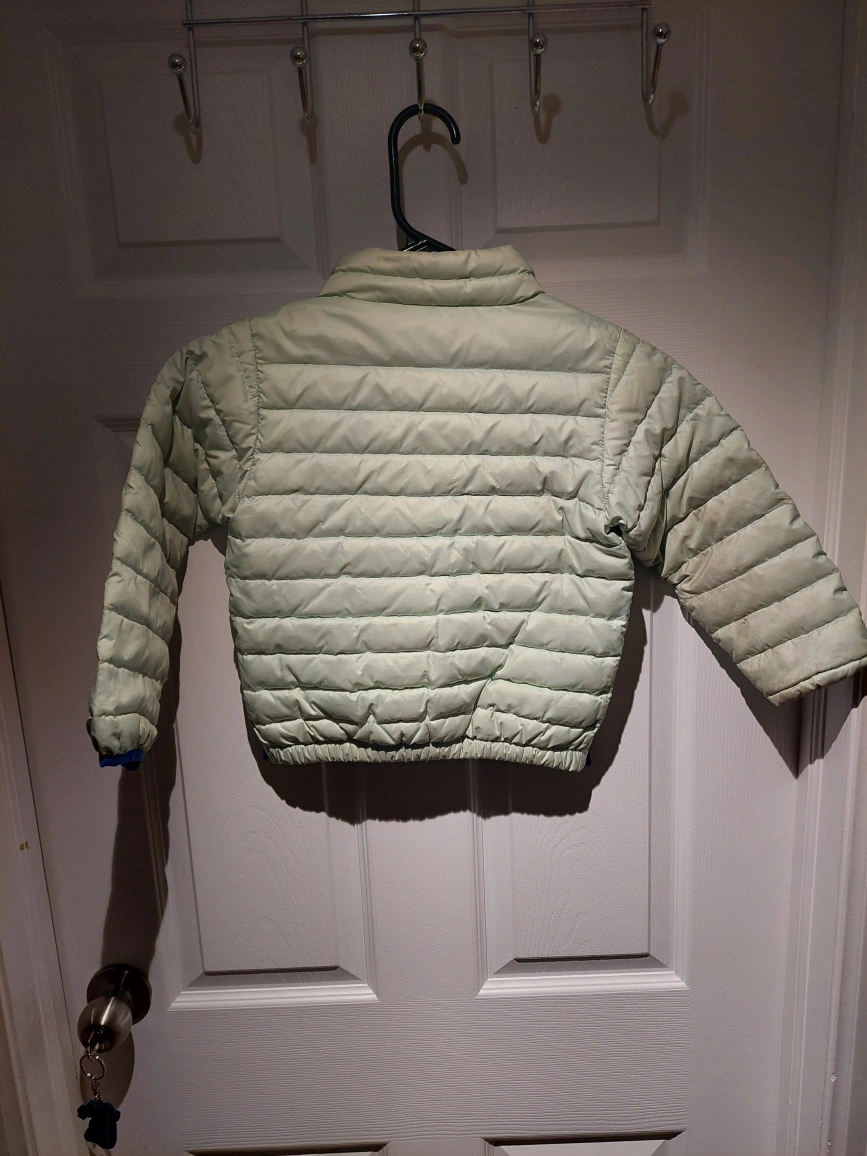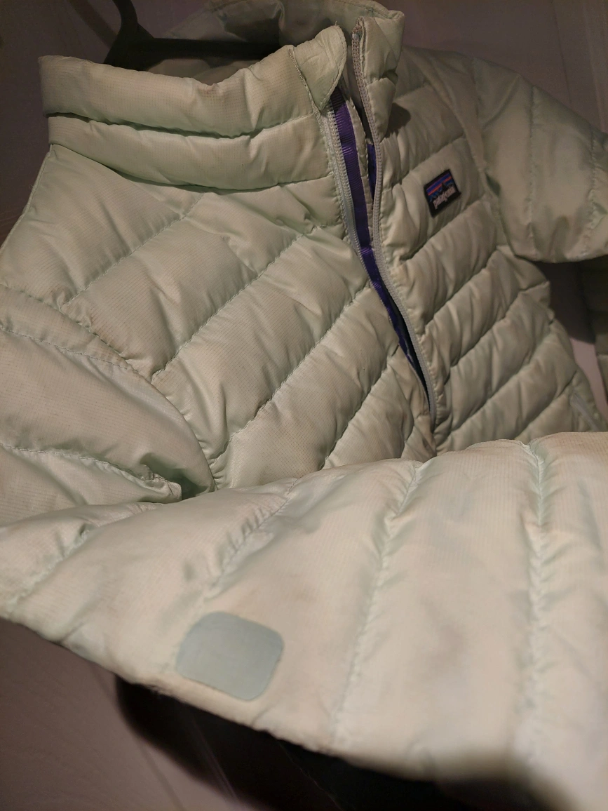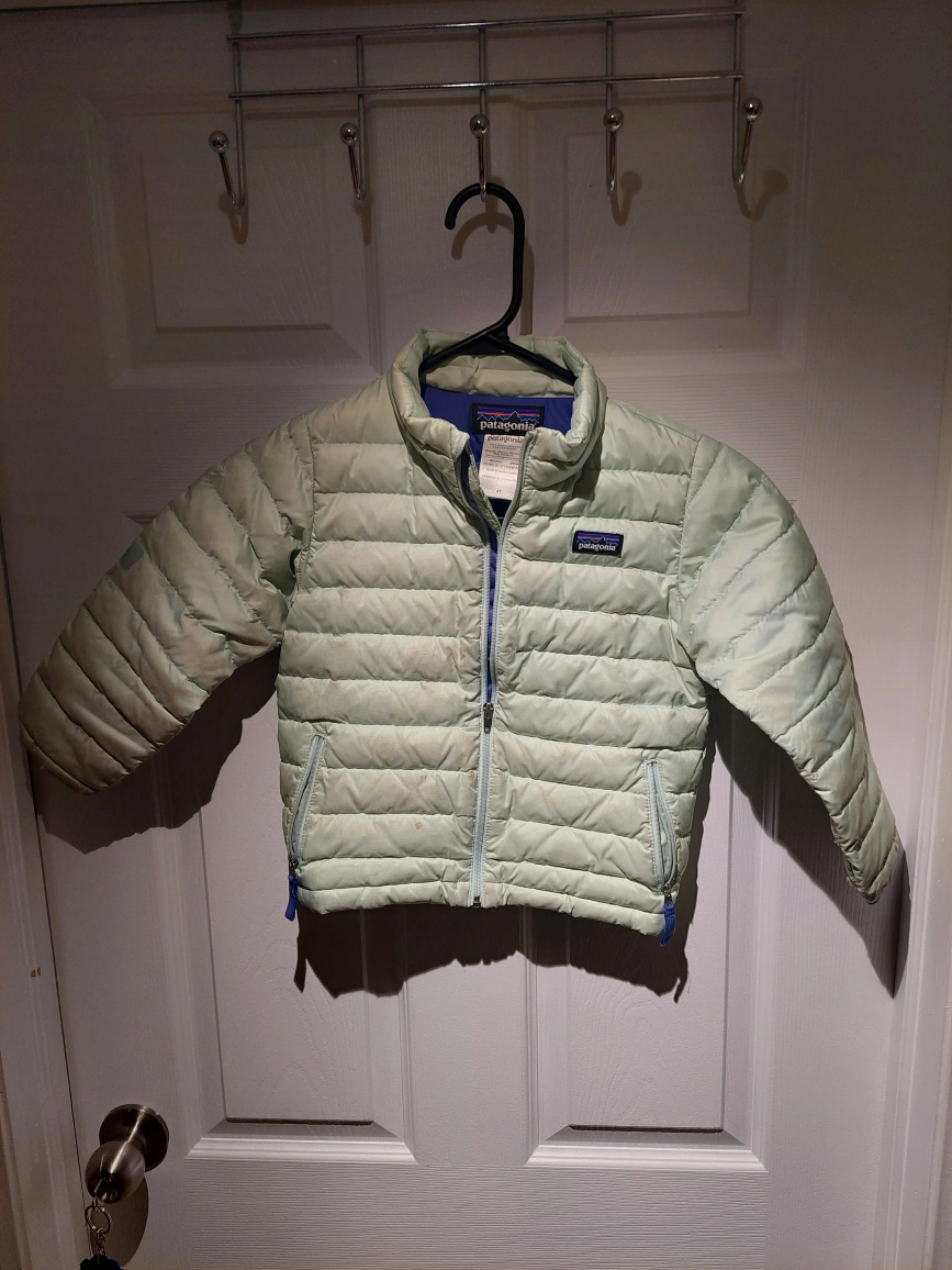 Lightly used Patagonia girls' down jacket. Size 4T. Light green colour. Some minor wear and staining. Zip-up front. Warm and comfortable.