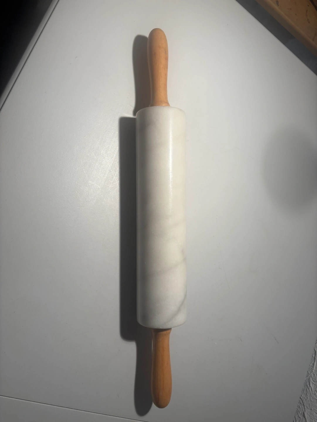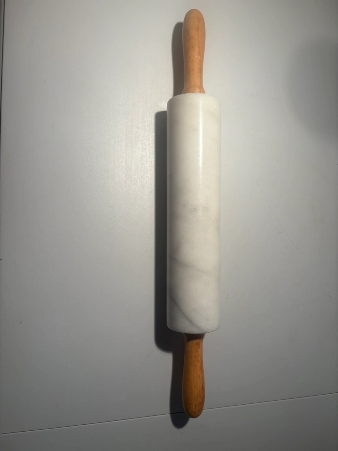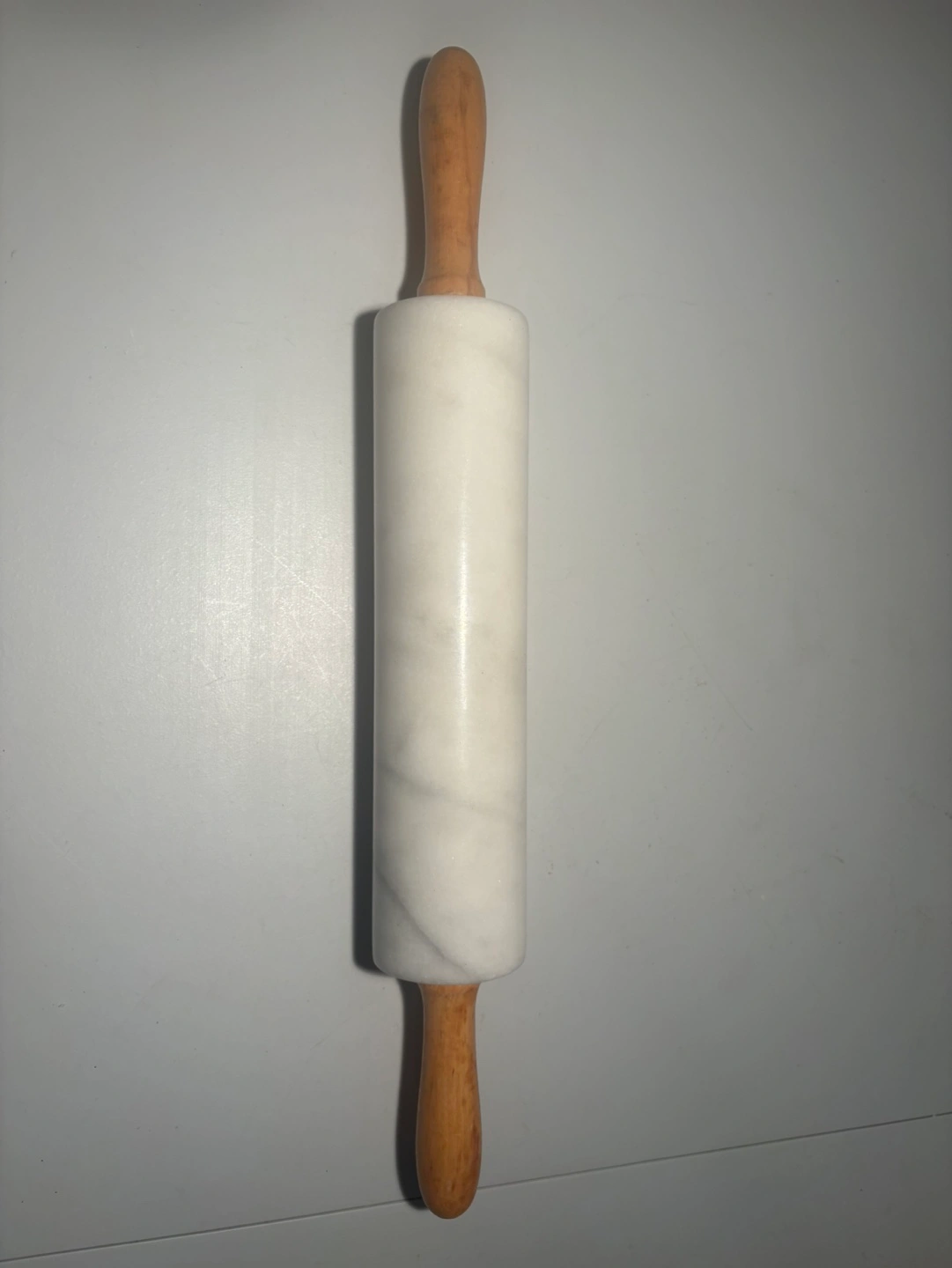 Vintage Heavy Marble Roling Pin With Wooden Handles and Stand - 18” Long In very good condition and includes the wooden stand to keep it from rolling around! White marble rolling pin. Wooden handles. Great for baking and pastry making. Solid and well-made. Pickup is south of the Pickering GO station at Bayly and Sandy Beach Road!