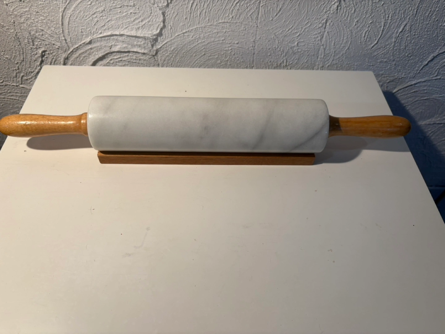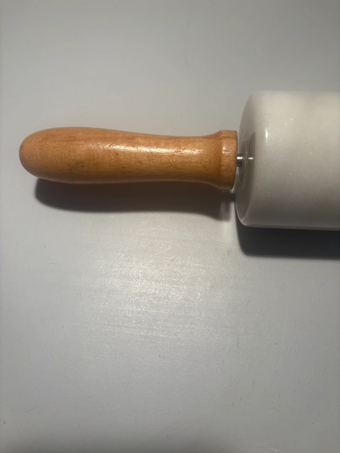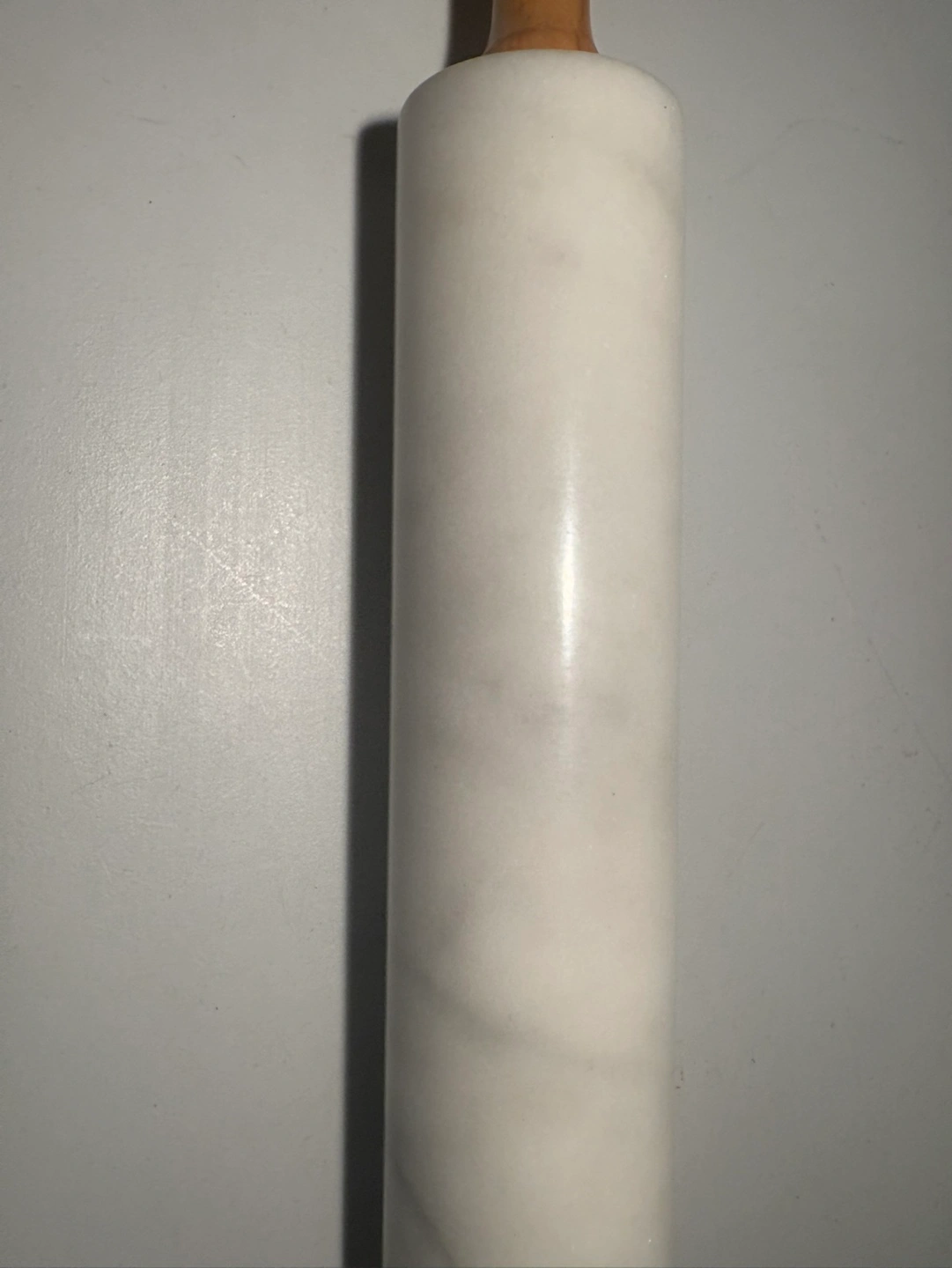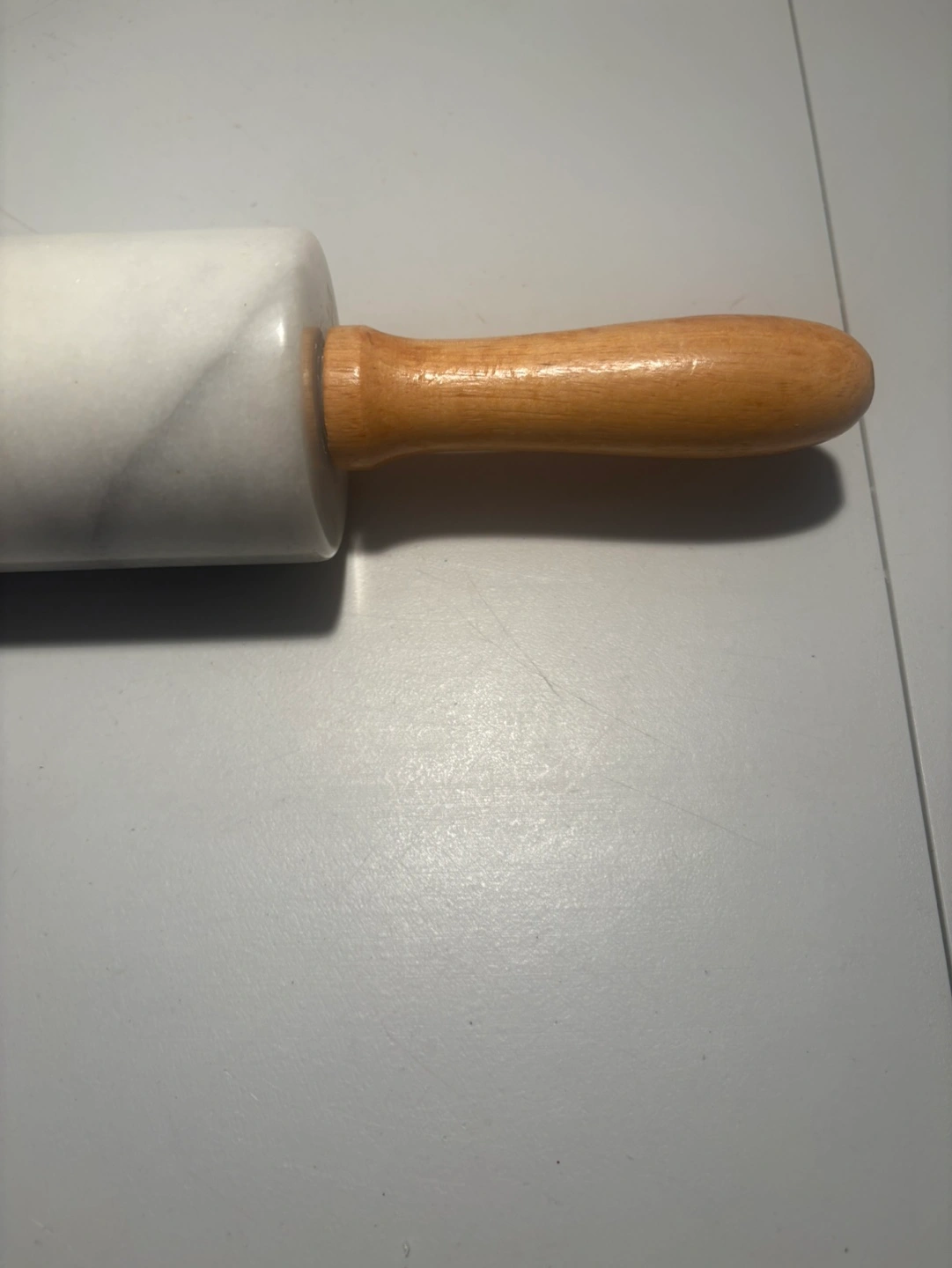 Vintage Heavy Marble Roling Pin With Wooden Handles and Stand - 18” Long In very good condition and includes the wooden stand to keep it from rolling around! White marble rolling pin. Wooden handles. Great for baking and pastry making. Solid and well-made. Pickup is south of the Pickering GO station at Bayly and Sandy Beach Road!