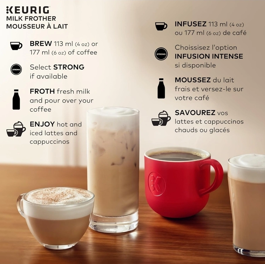 Red Keurig milk frother. Froths hot and cold milk. Easy to clean. Makes lattes and cappuccinos. Never been used and sells for 69.68 originally 79.99 See images for dimensions.