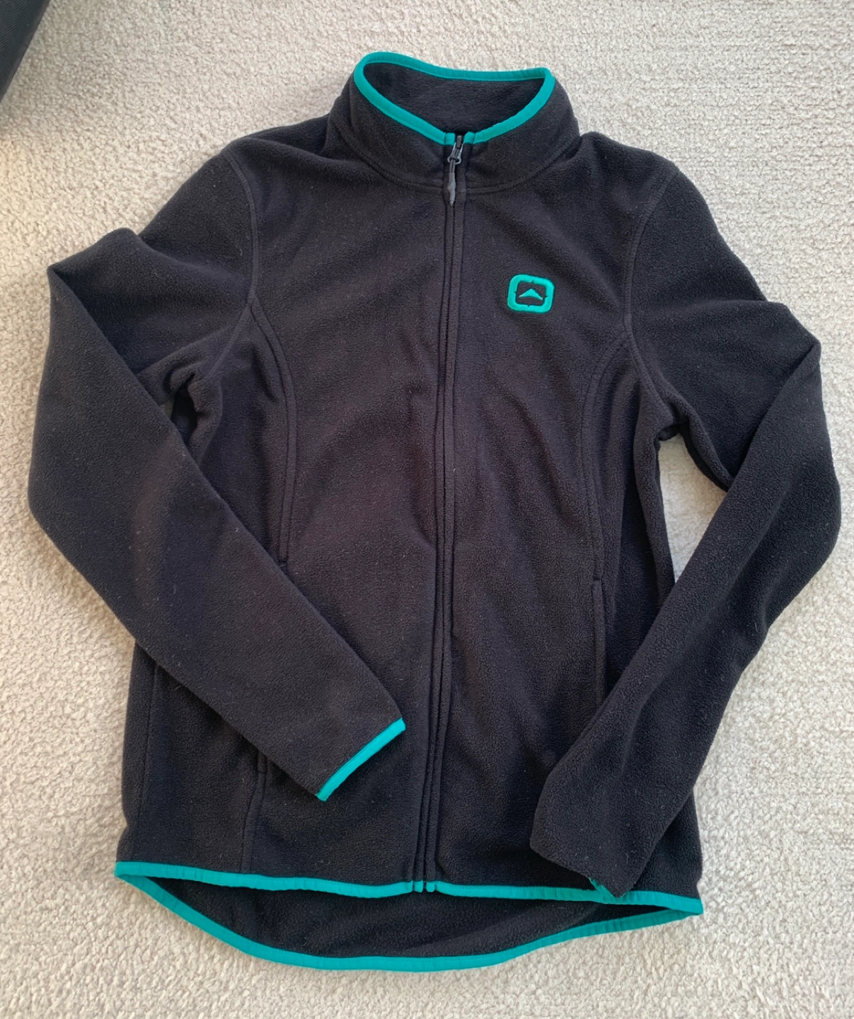 Women's black fleece jacket. Full zip. Teal accents. Long sleeves. Small logo on chest