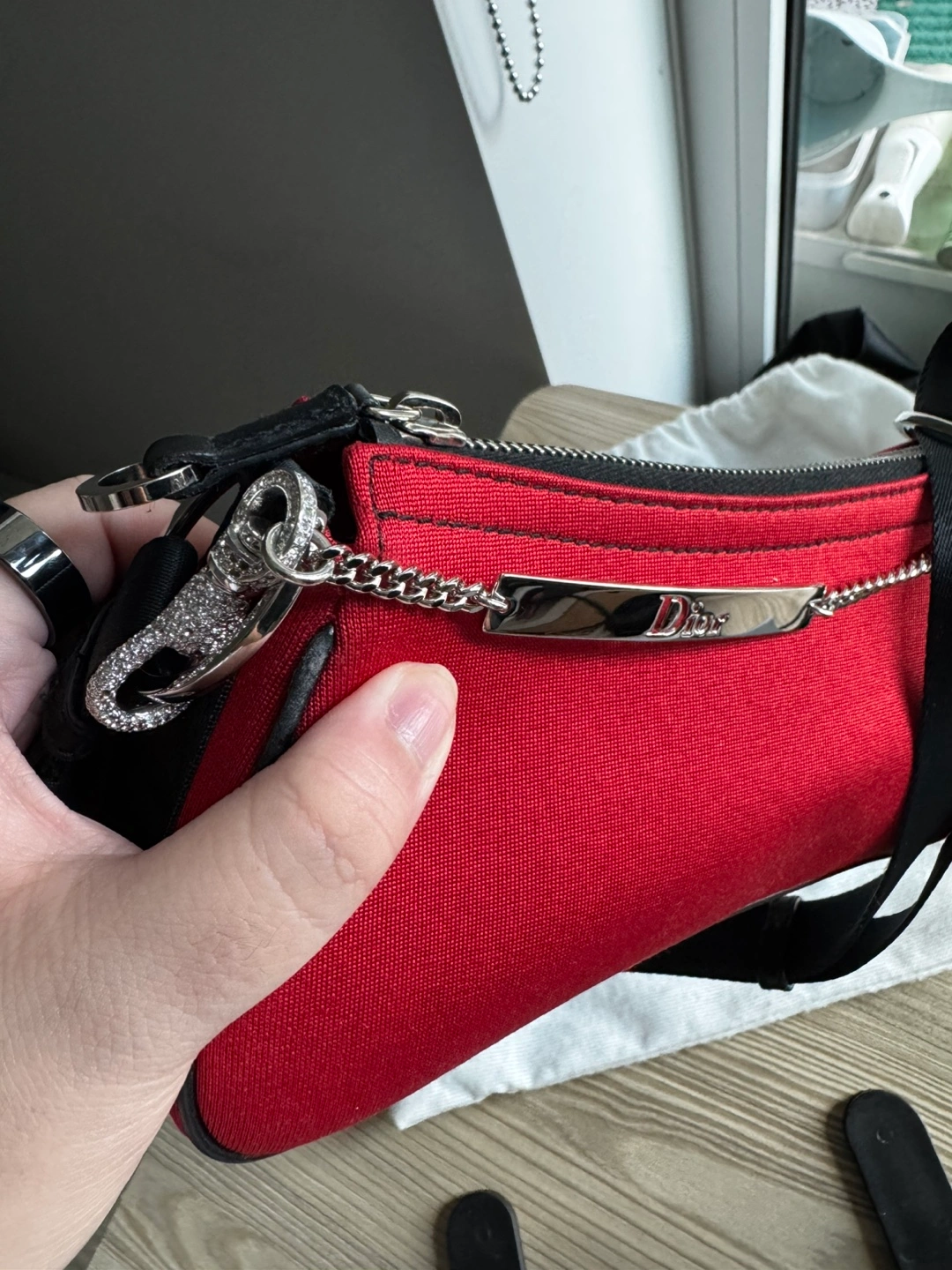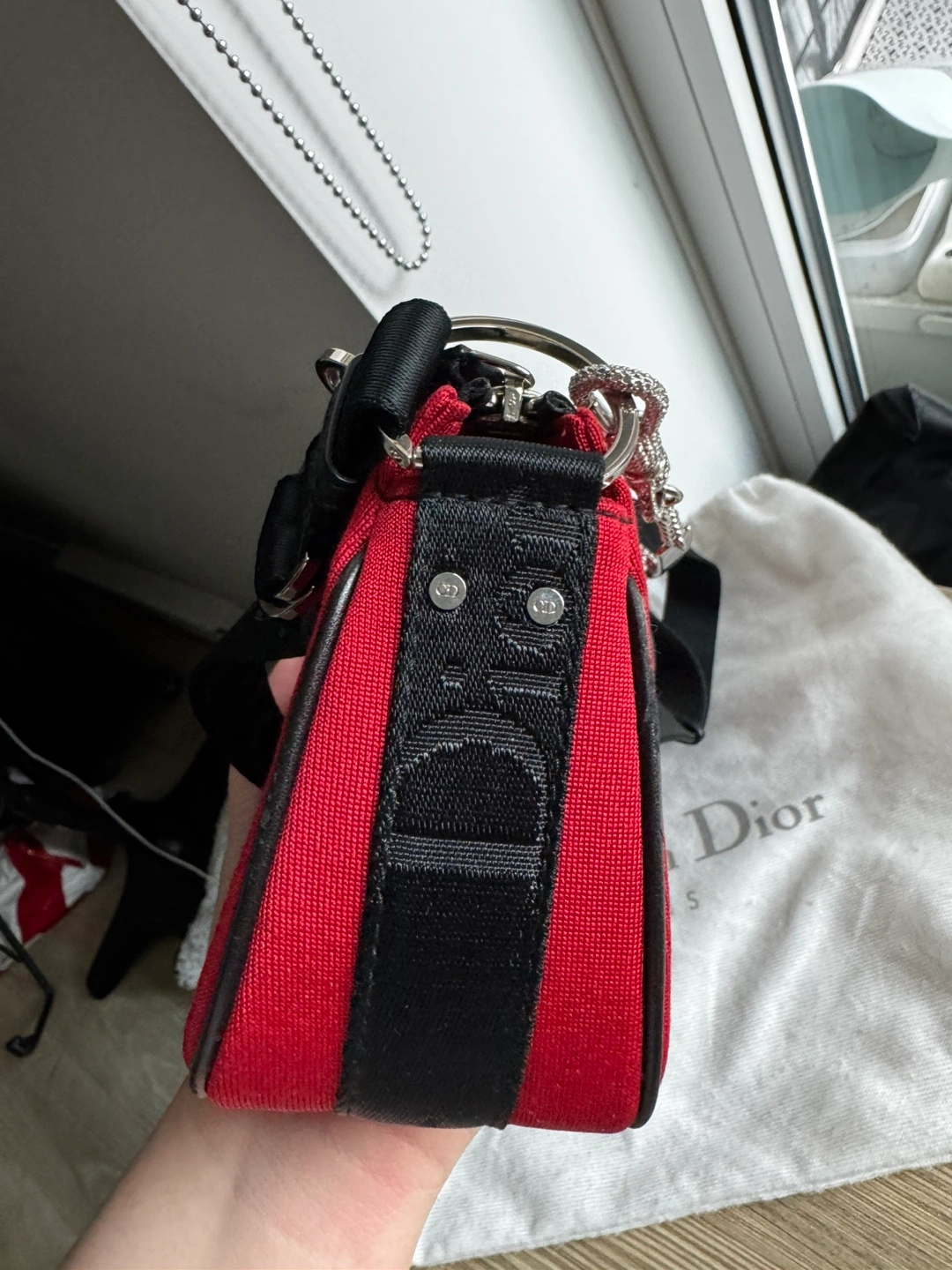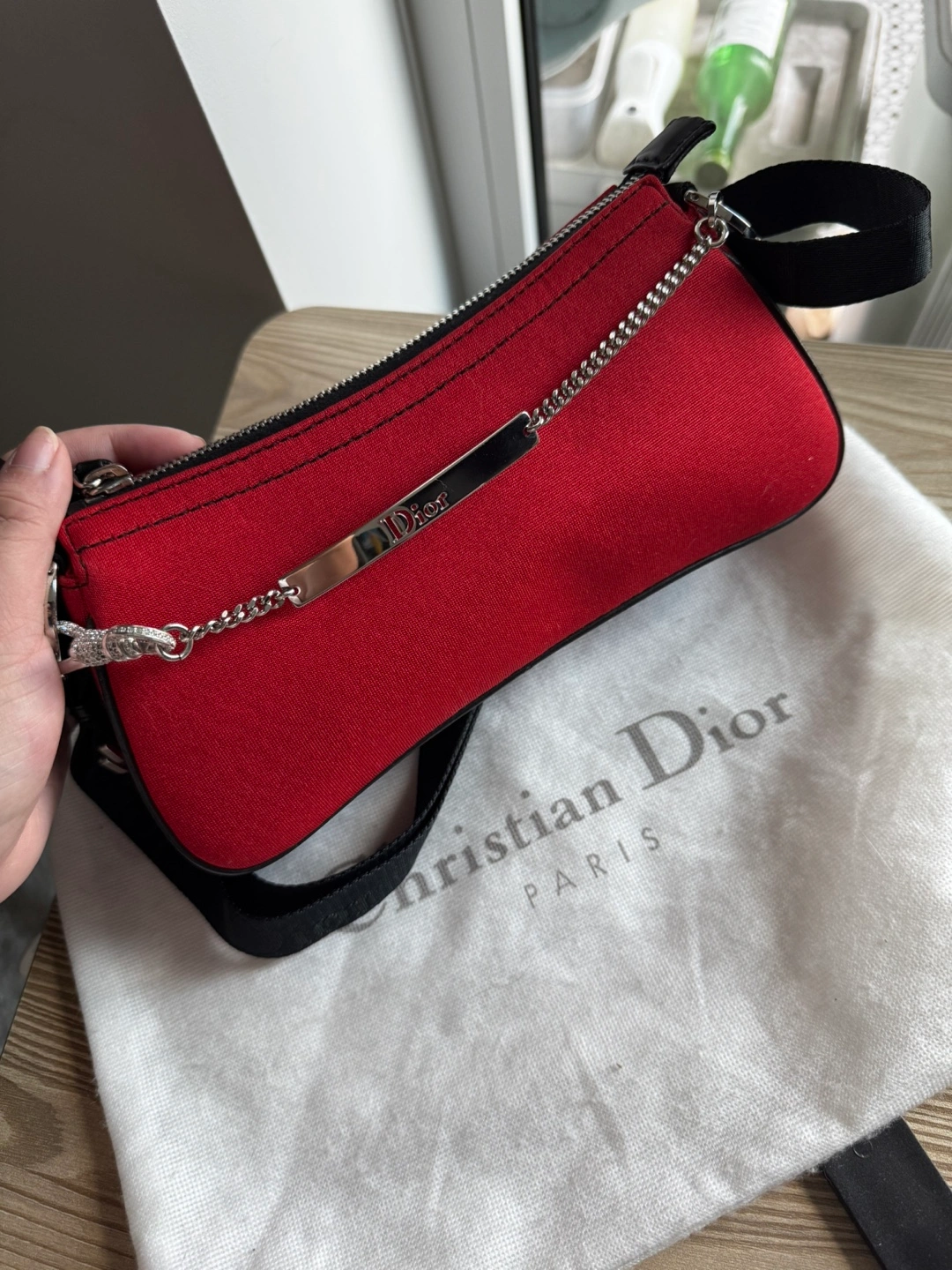Red and black fabric shoulder bag. Features a silver-toned Dior logo plate and adjustable strap. Comes with dust bag.