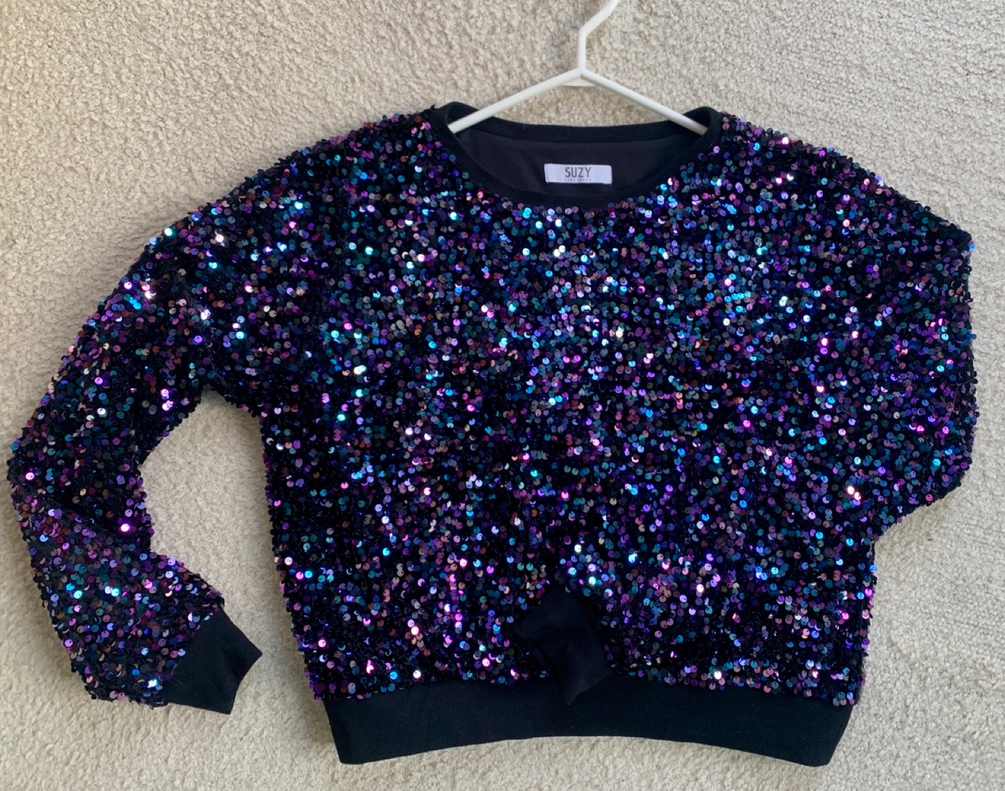 Sequin sweater. Long sleeves, crew neck. Black ribbed cuffs and hem. Lined inside. Very comfy. Worn once then hand washed.