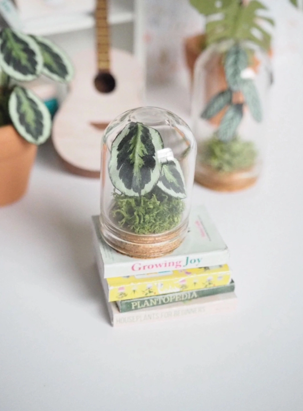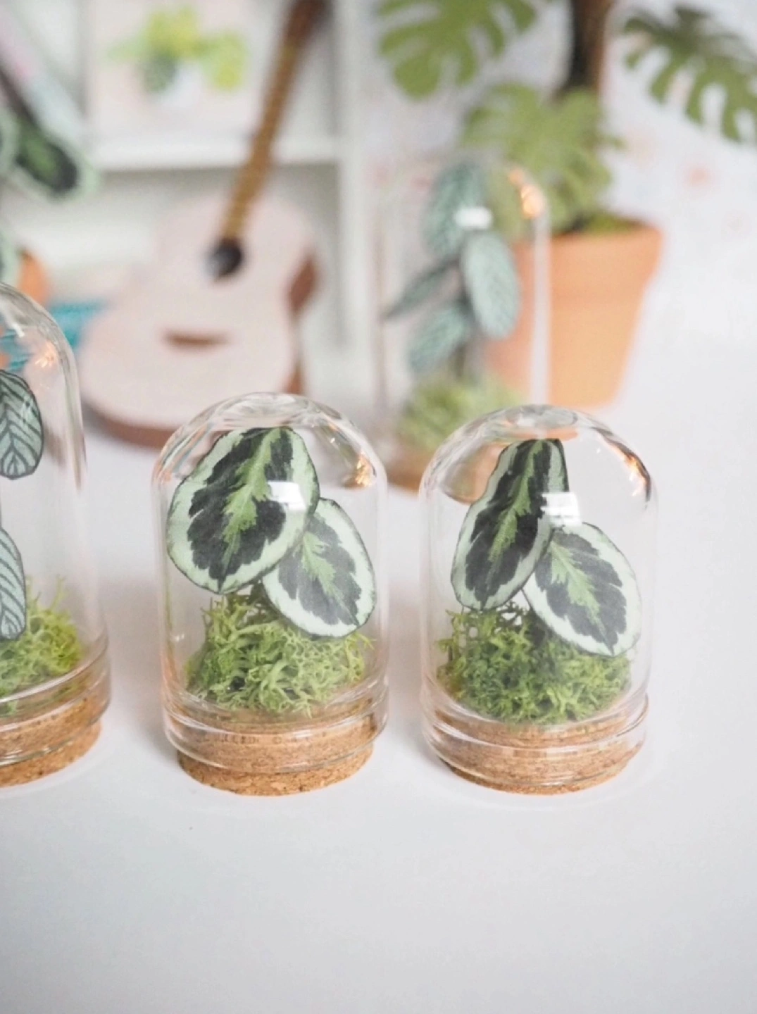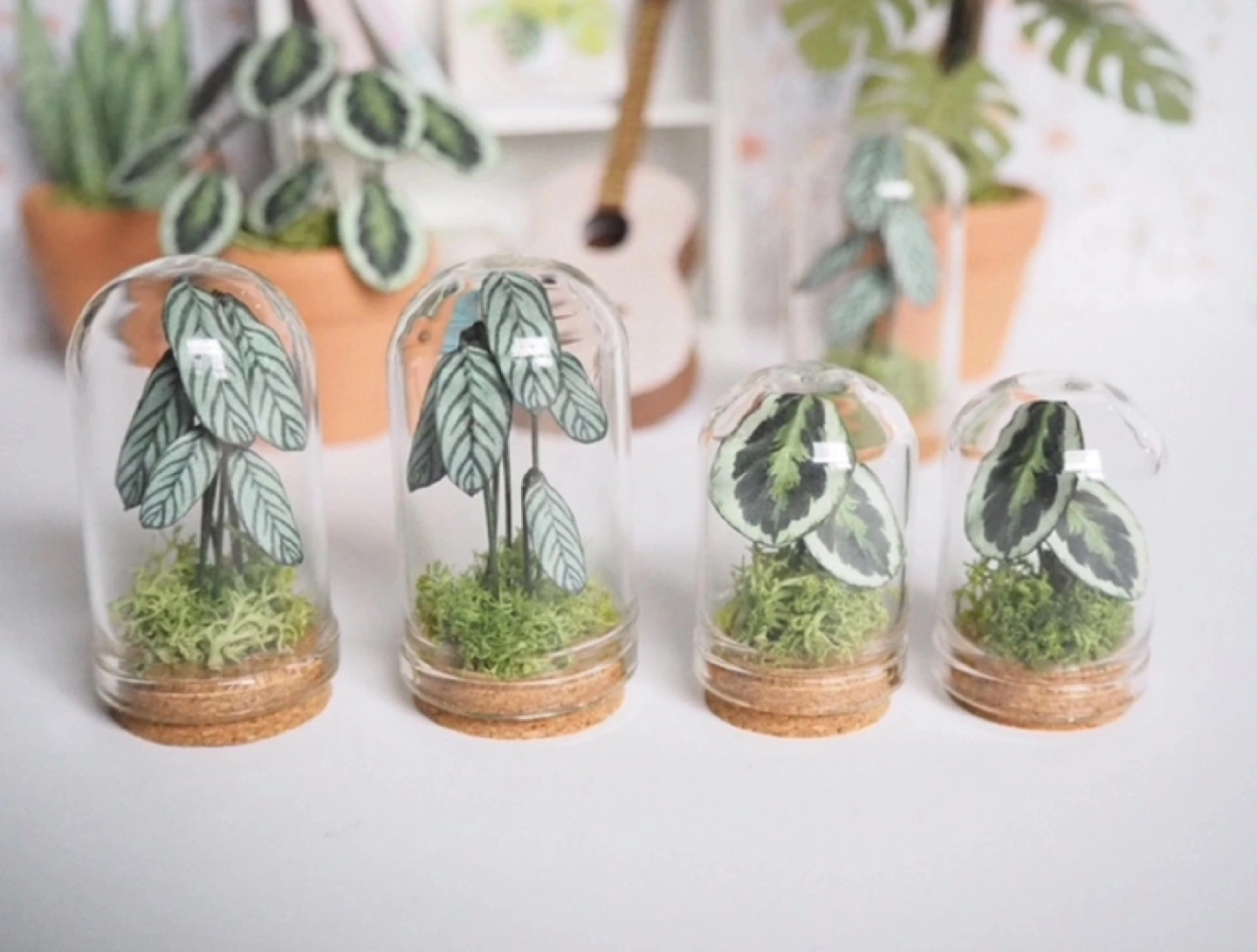 1:12 Scale Miniature Dollhouse Collectible Plant in Glass Cloche. Plant is made from paper and wire and the moss is real preserved moss. Enclosed with a glass cloche with a cork base. Perfect for the miniature/plant lover! (Not intended as a childrenβs toy) Handmade and brand new. I have two of each available as photographed.