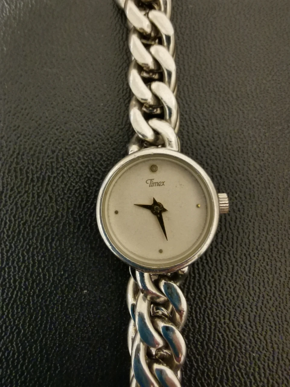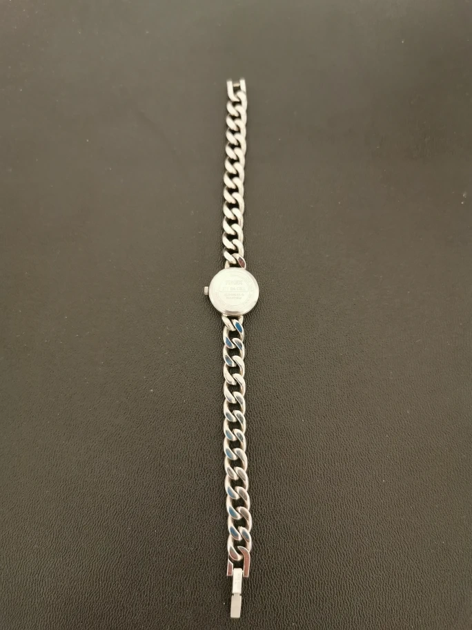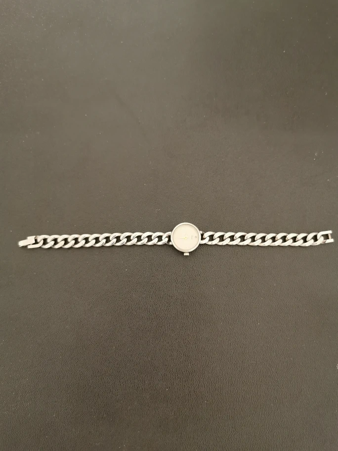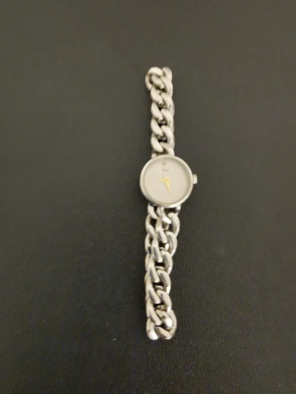 Elegant women's wristwatch. Features a round silver face and a Interlockes silver chain bracelet. Quartz movement. Pre-owned. Watch battery needed.