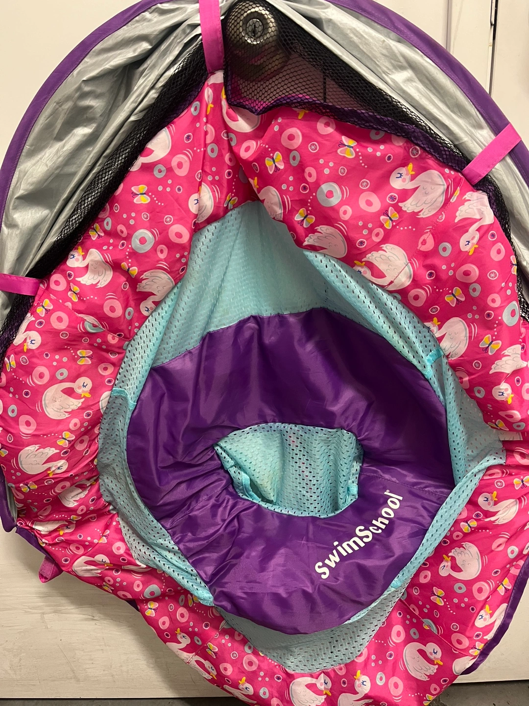 Good condition. Infant swim trainer. Pink and purple design. Features mesh sides. Good for supervised water play.