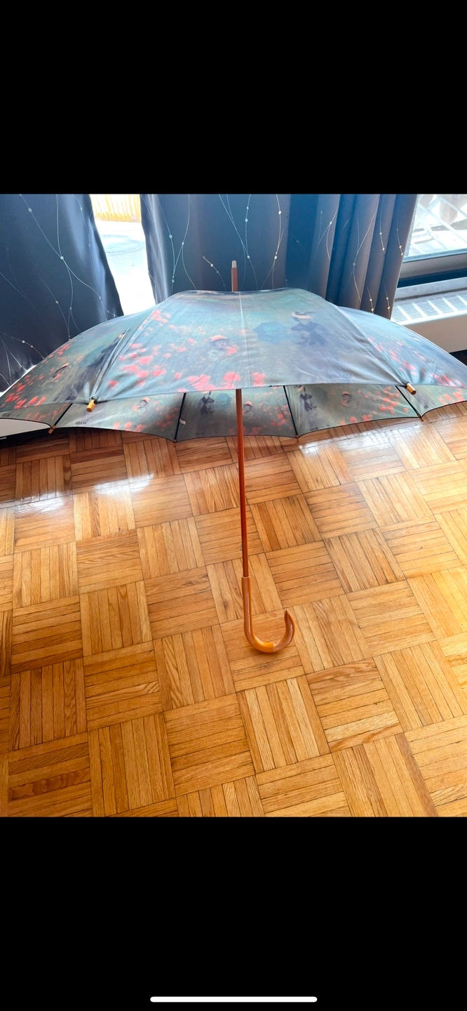 747Beautiful umbrella. Features an artistic print. Wooden handle. Compact fold.