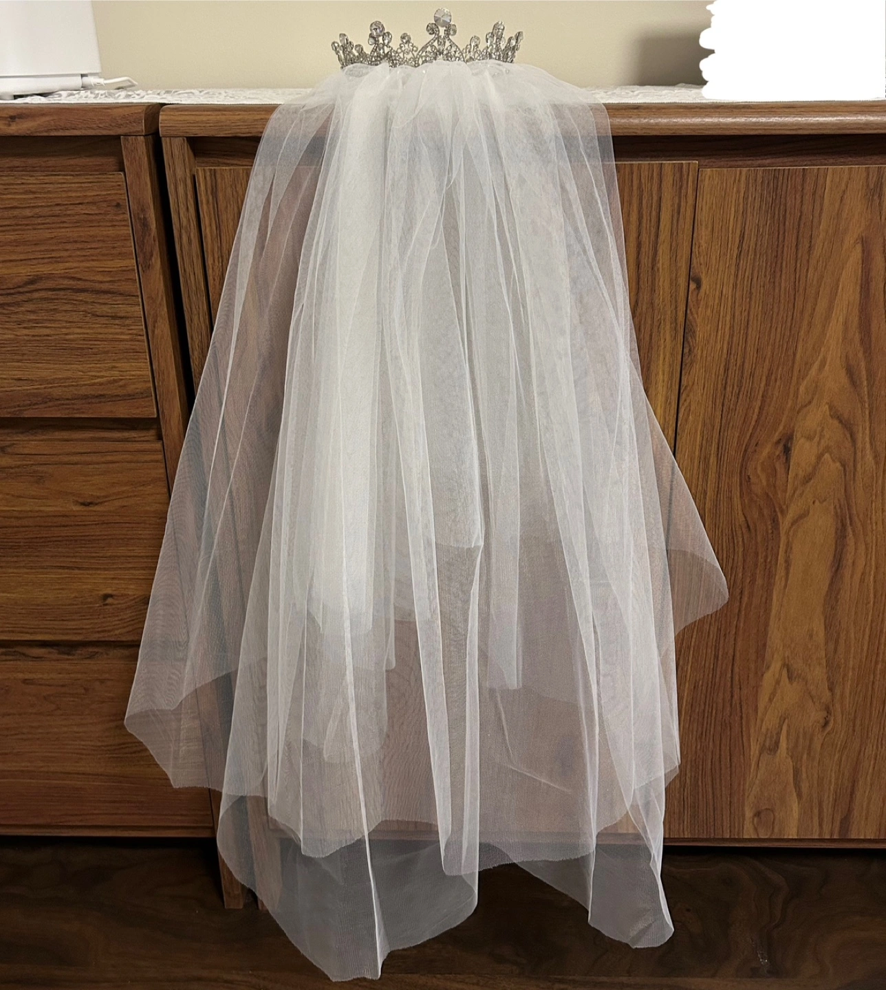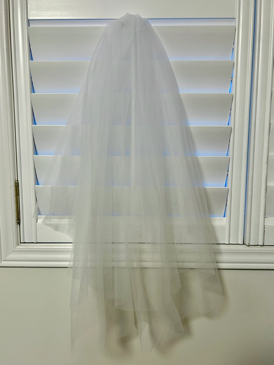 Gorgeous silver bridal crown. Features intricate detailing and sparkling stones. Matching white bridal veil. Beil is two layors. Perfect for weddings or special occasions.