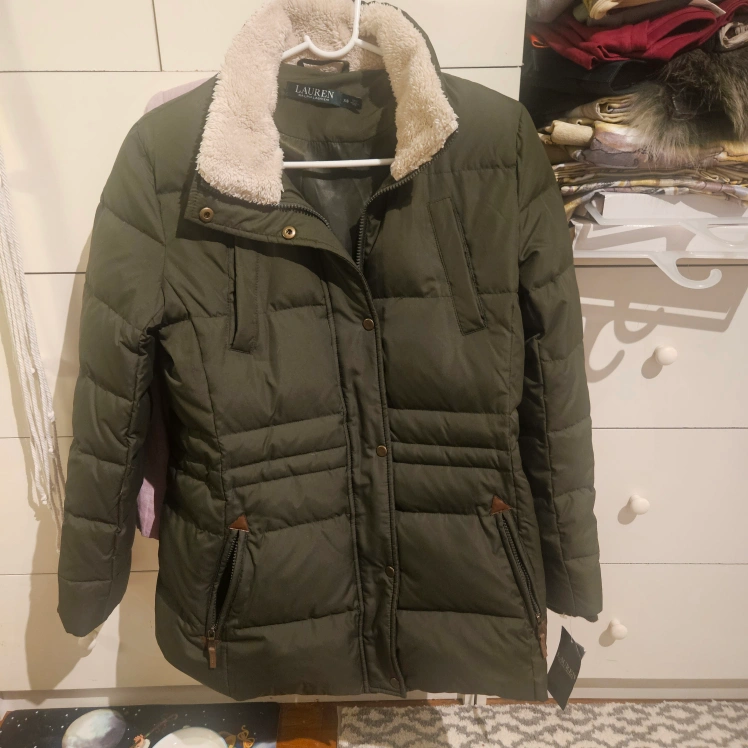 Women's olive green Boys puffer jacket. Features sherpa lined collar. Zipper and button closure. Multiple pockets. Cold weather tested.Ralph Lauren