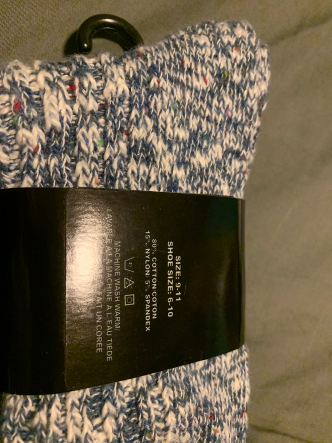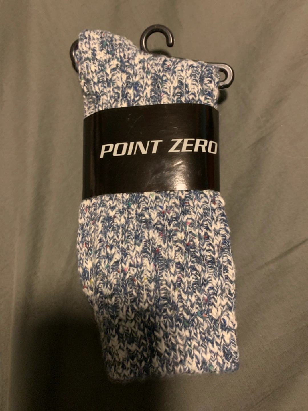 1000+New Point Zero crew socks. Size 9-11. Blue and white speckled pattern. 80% cotton, 15% nylon, 5% spandex. Machine washable.