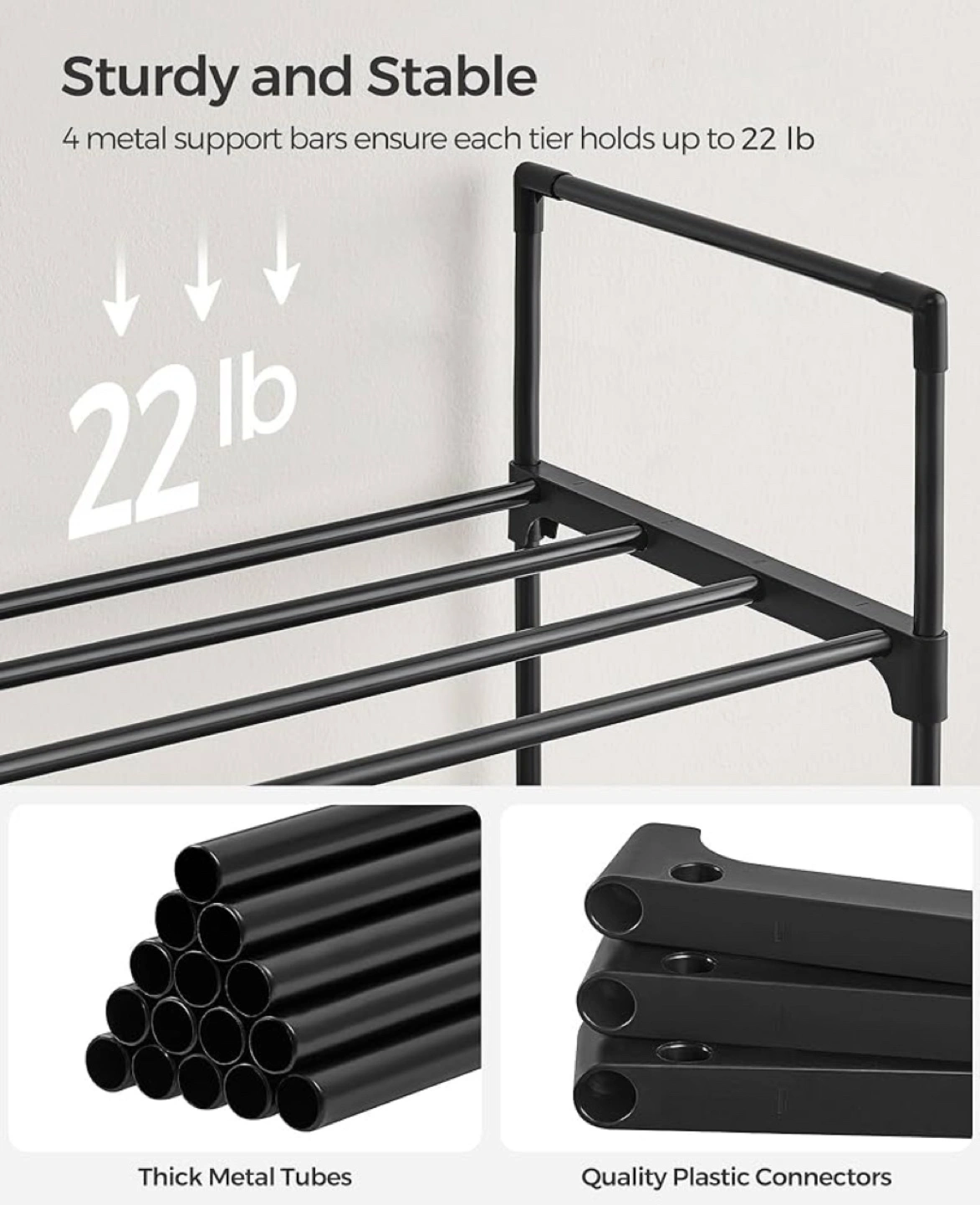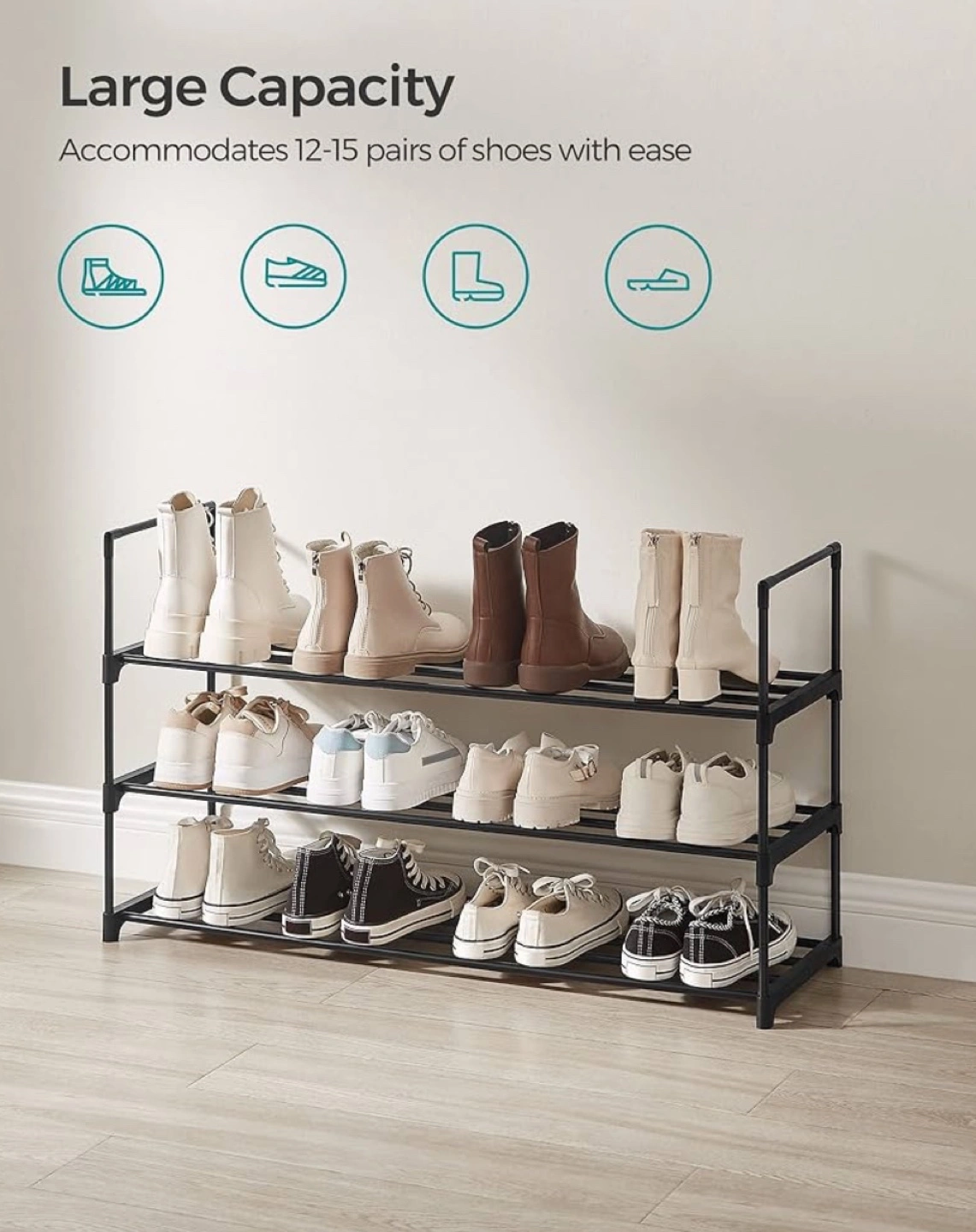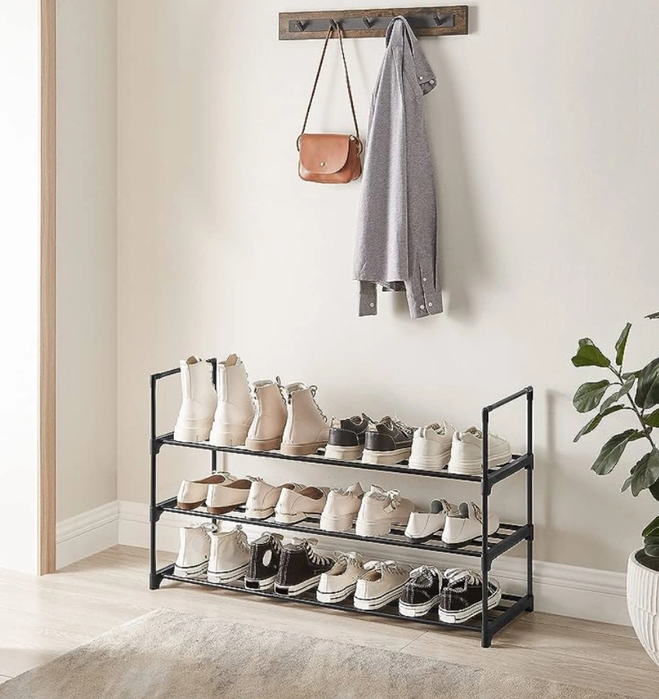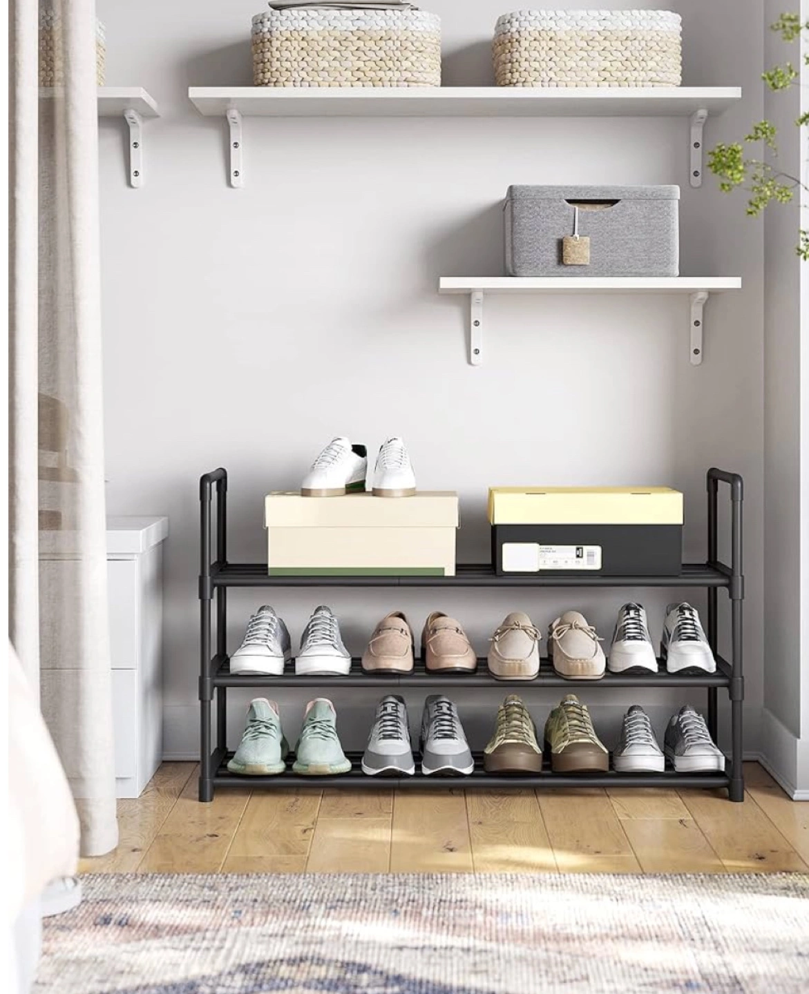 530BRAND NEW! Three-tier shoe storage, sturdy metal frame. Holds approximately 12-15 pairs of shoes. Easy assembly. Compact design, ideal for entryways or closets.