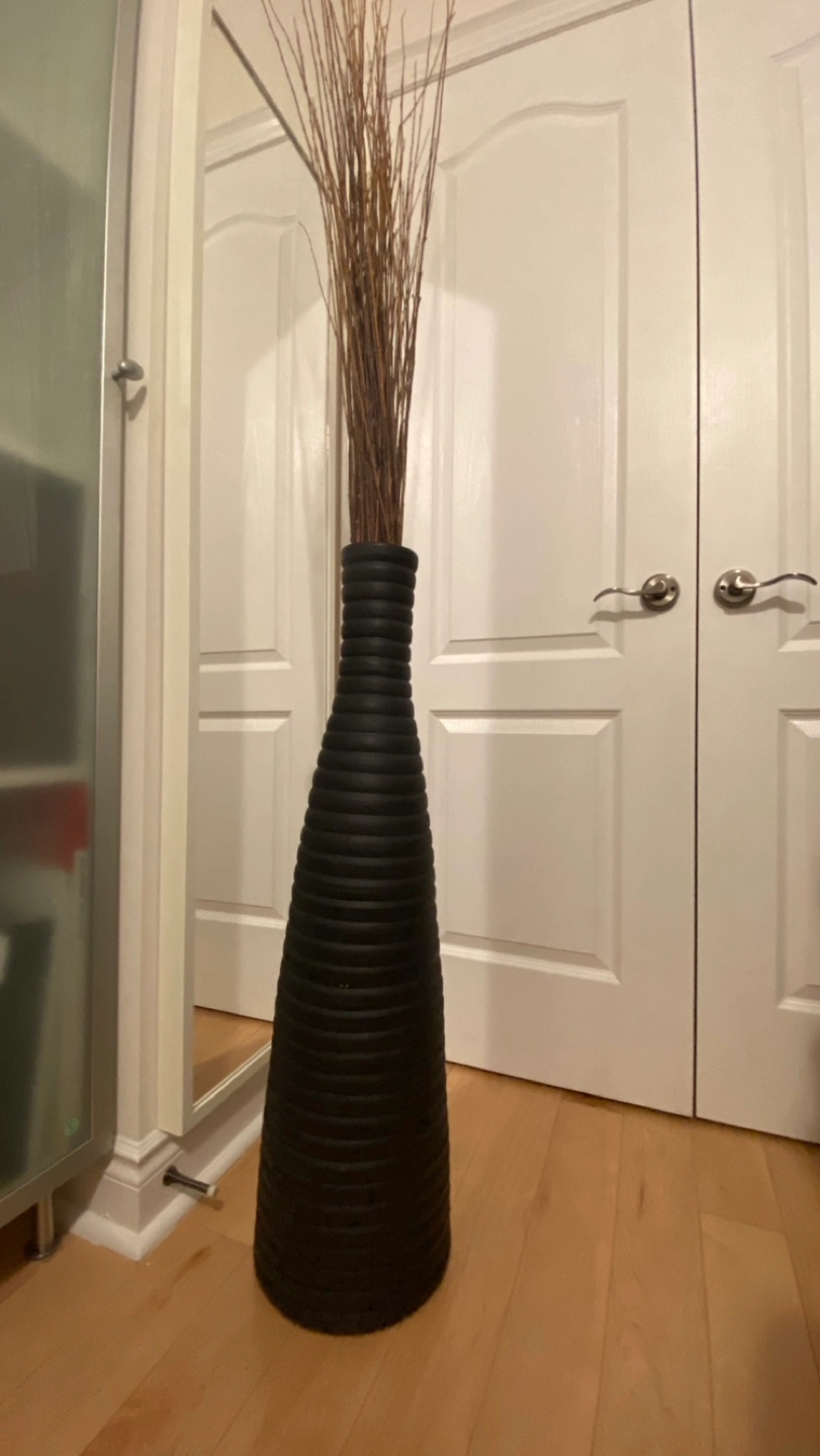 Large black vase. Unique ribbed design. Perfect for dried floral arrangements or as a standalone statement piece. Floor vase.