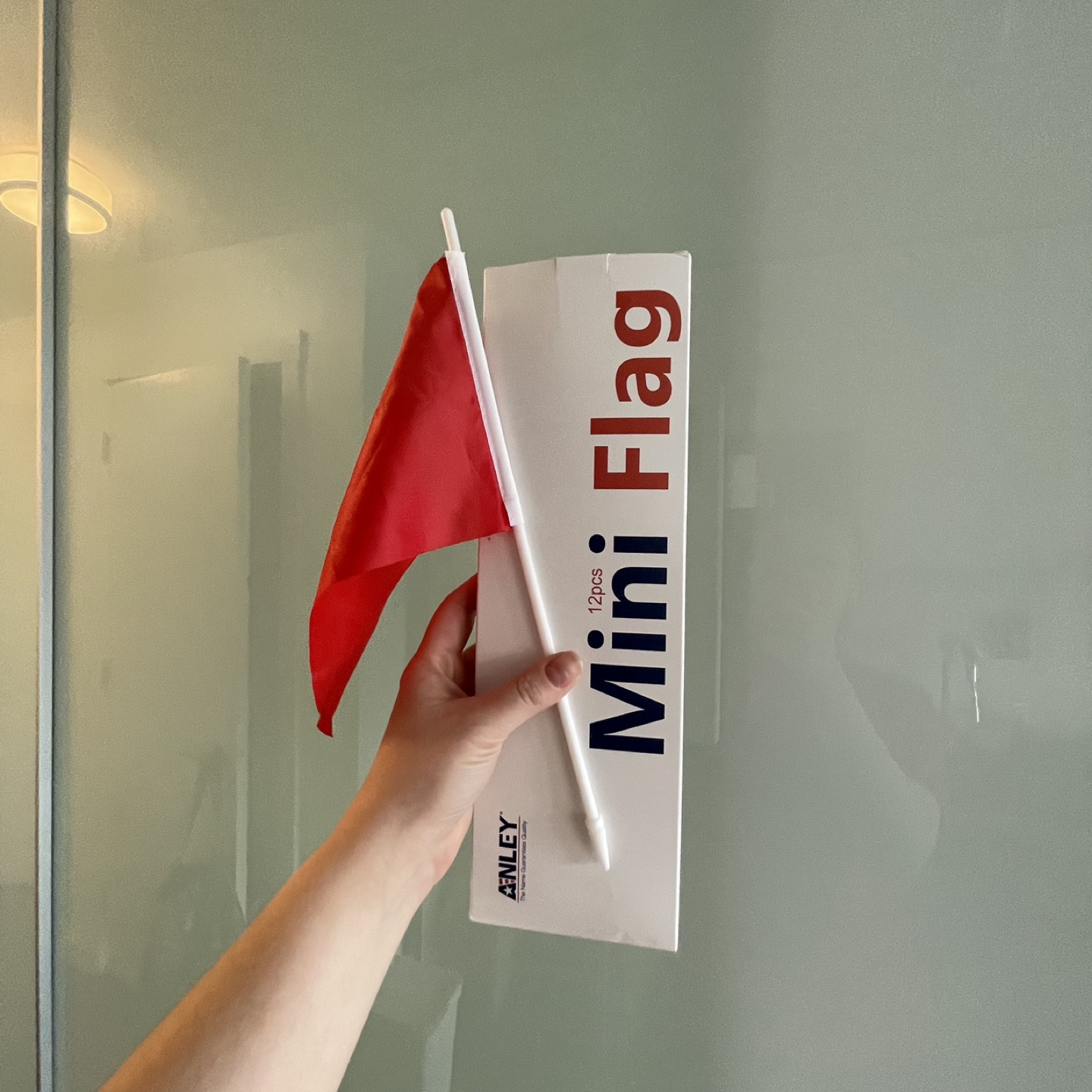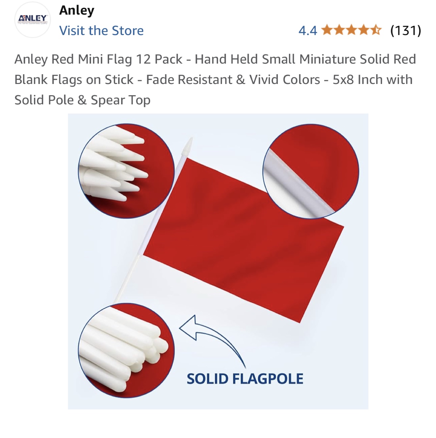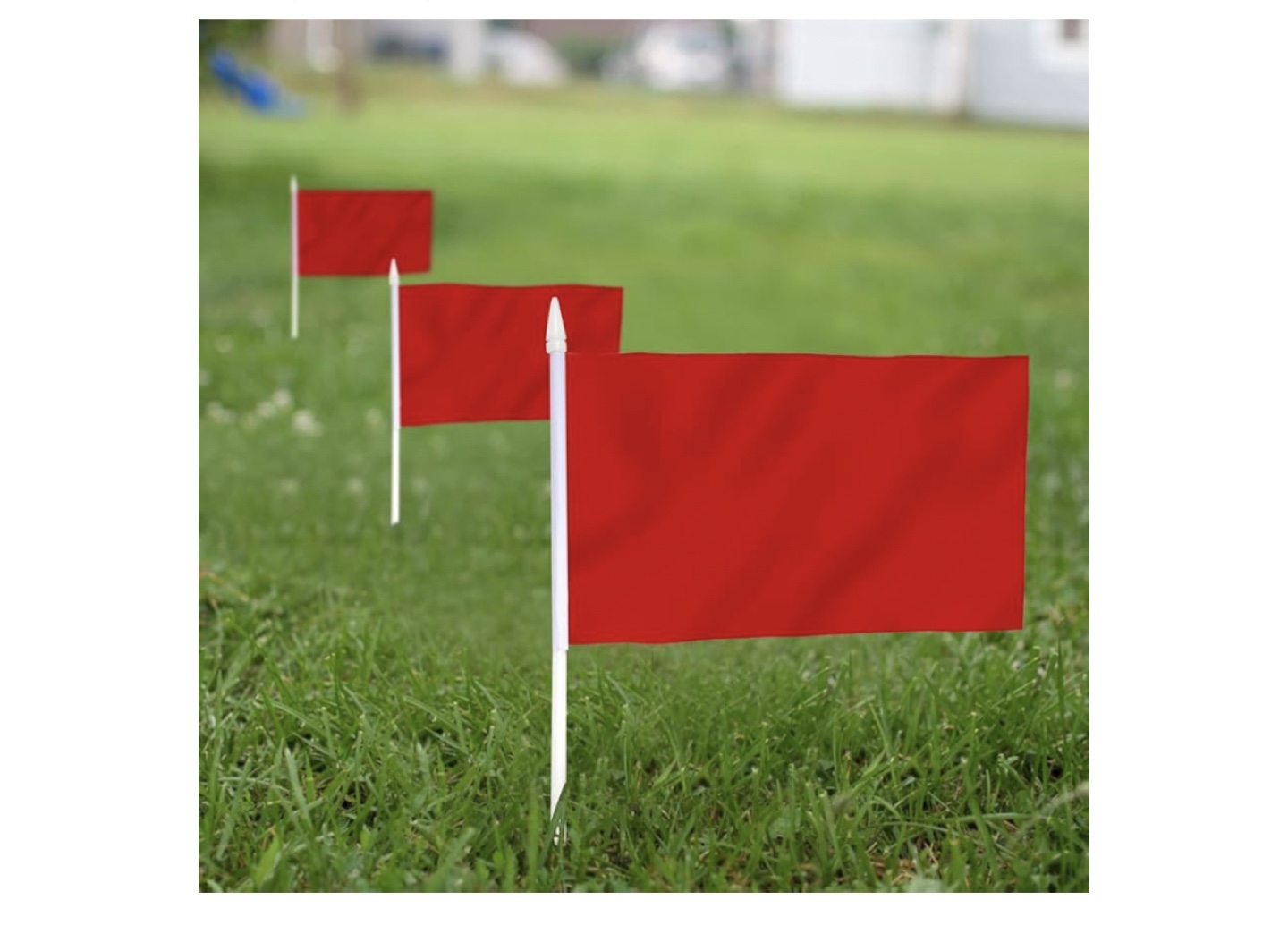 12 pack of small red flags. 5x8 inch miniature flags on sticks. Fade resistant & vivid colours. Solid pole & spear top.