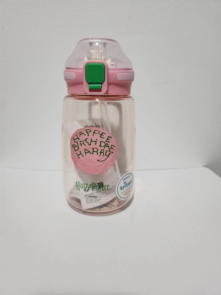 Pink plastic water bottle with a straw. Features a Harry Potter design and a handwritten birthday message. Made with Eastman Tritan.