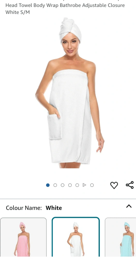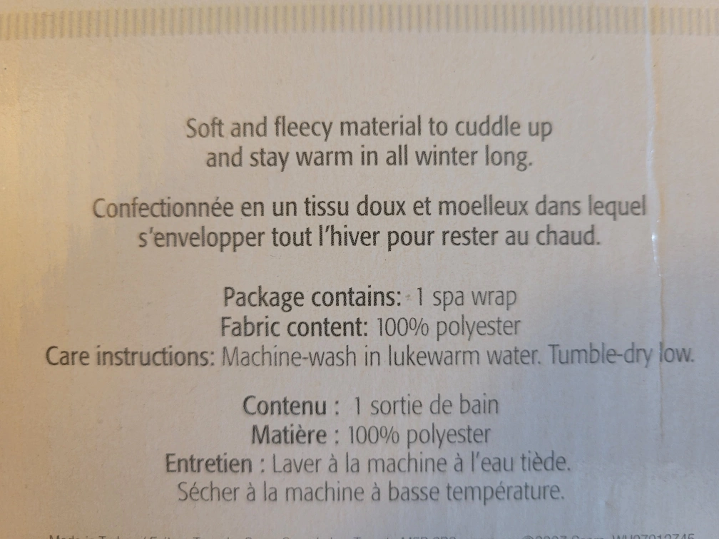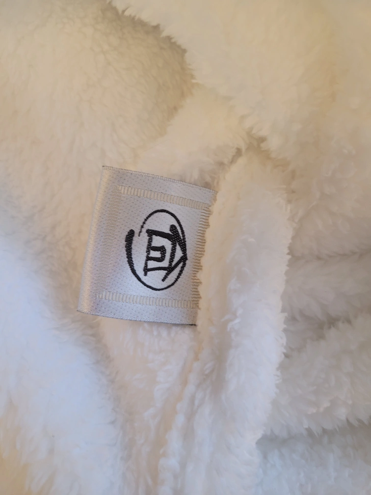 White fluffy spa wrap bathrobe. Features adjustable closure and convenient pocket. Soft and absorbent. Perfect for after showers or relaxing at home.