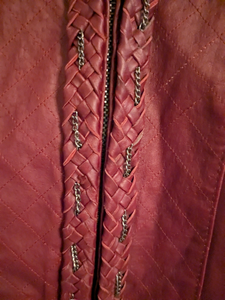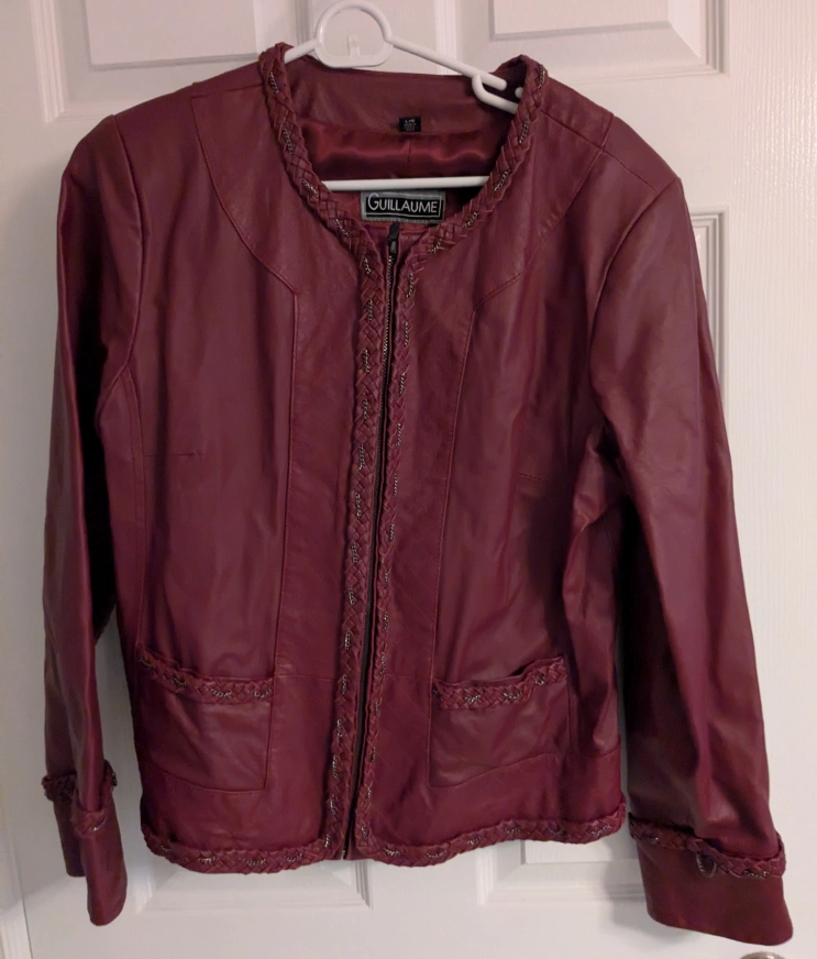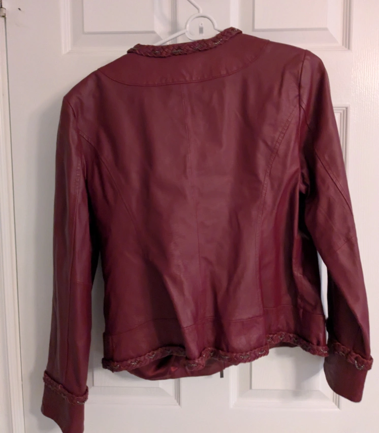 Burgundy genuine leather jacket. Braided accents. Full zip closure. Two front pockets. Lined.