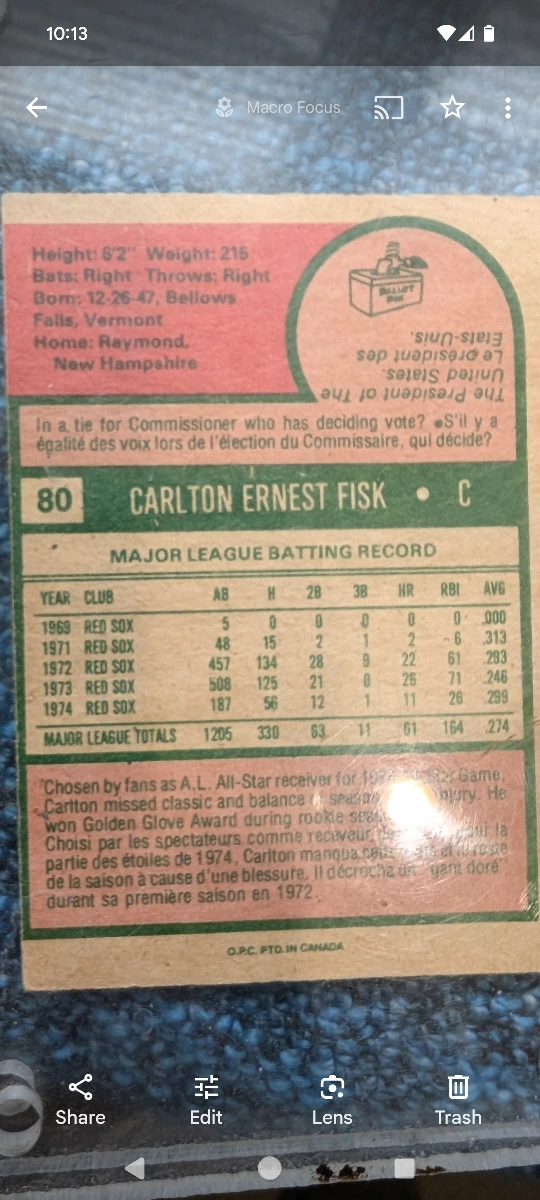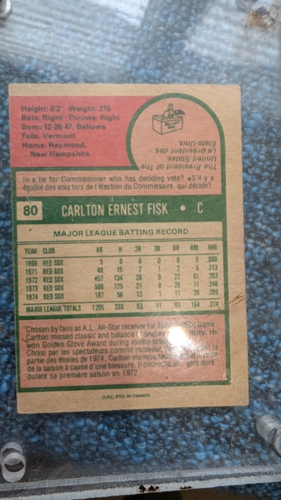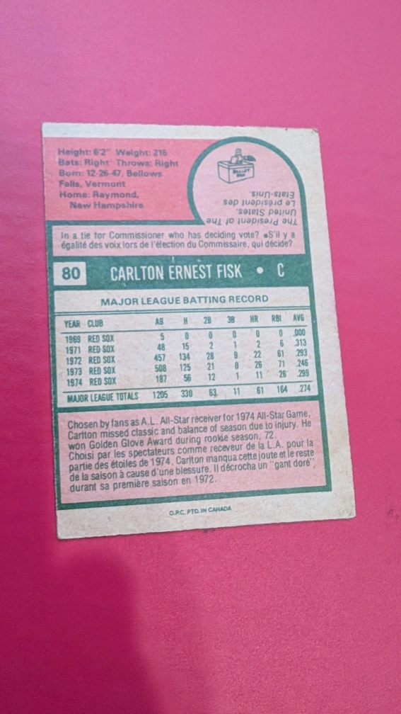 ππ-RARE-Vintage Carlton Fisk baseball card. 1974 Topps. Number 80. Shows him in a Red Sox uniform. Card is in a protective plastic case. in good condition.FCFS ASKING 13.00 O.B.O.