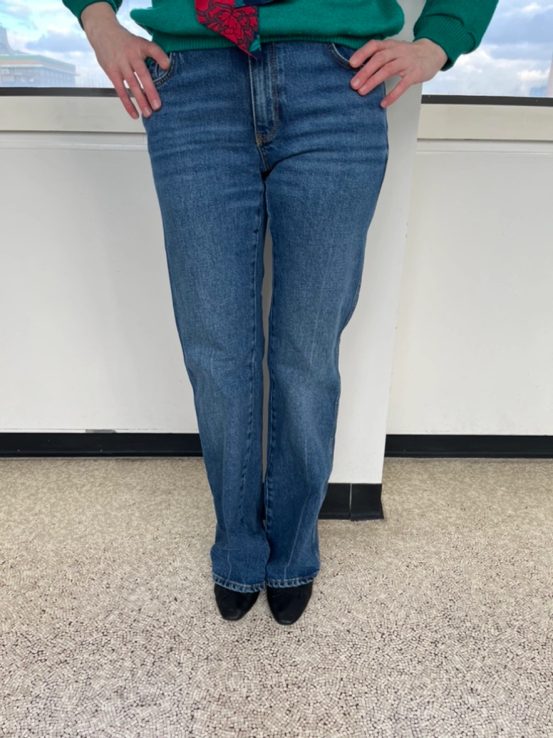 Straight leg jeans, medium wash denim. Classic five-pocket design; extra long (pant length 109 cm). Look amazing with heels.