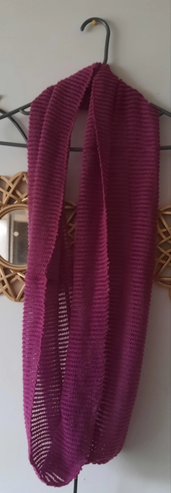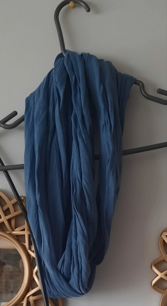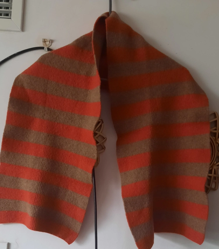 9 scarves in various colours and styles. Orange and brown striped scarf, dark pink infinity scarf, black and beige striped scarf, and two blue infinity scarves, two solid and one textured. Perfect for adding a pop of colour to your outfits.