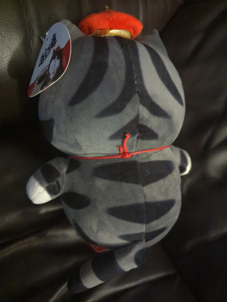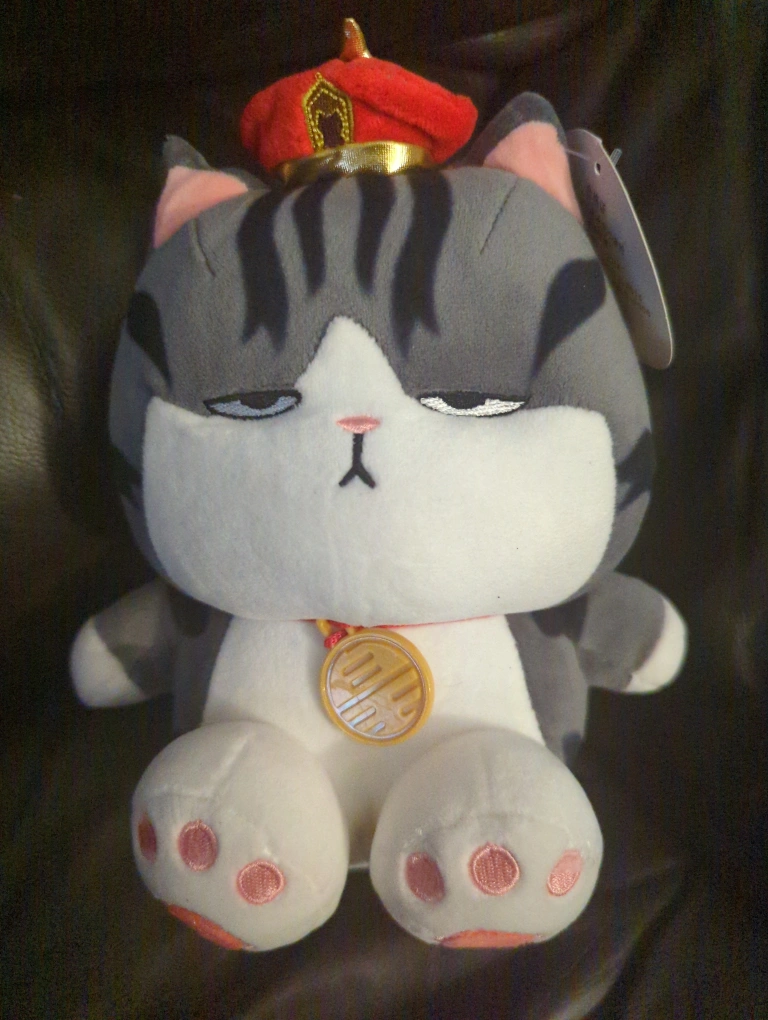 grumpy grey tabby cat plush toy wearing a red hat with gold trim and small gold medallion around neck, soft, new with tags