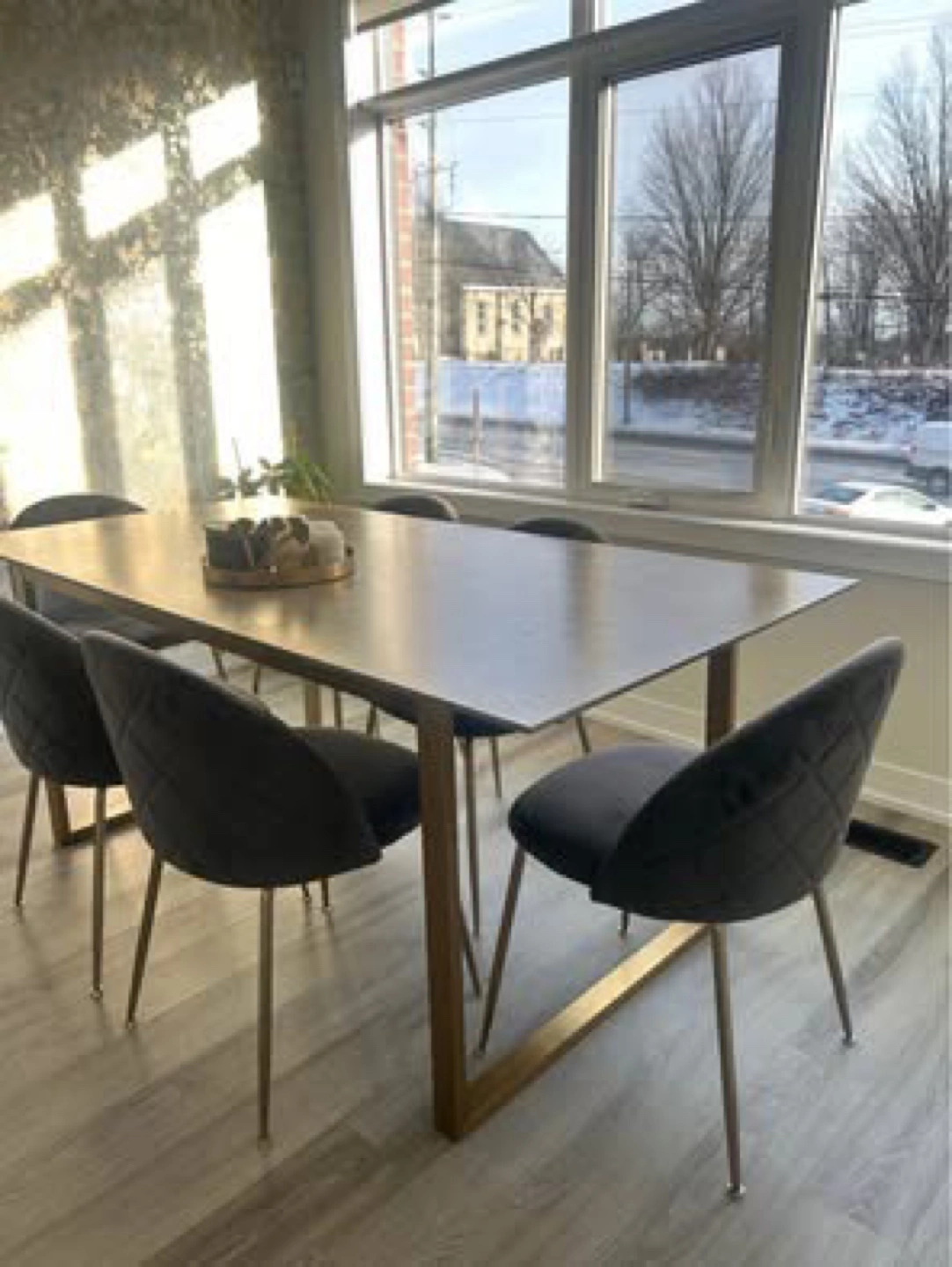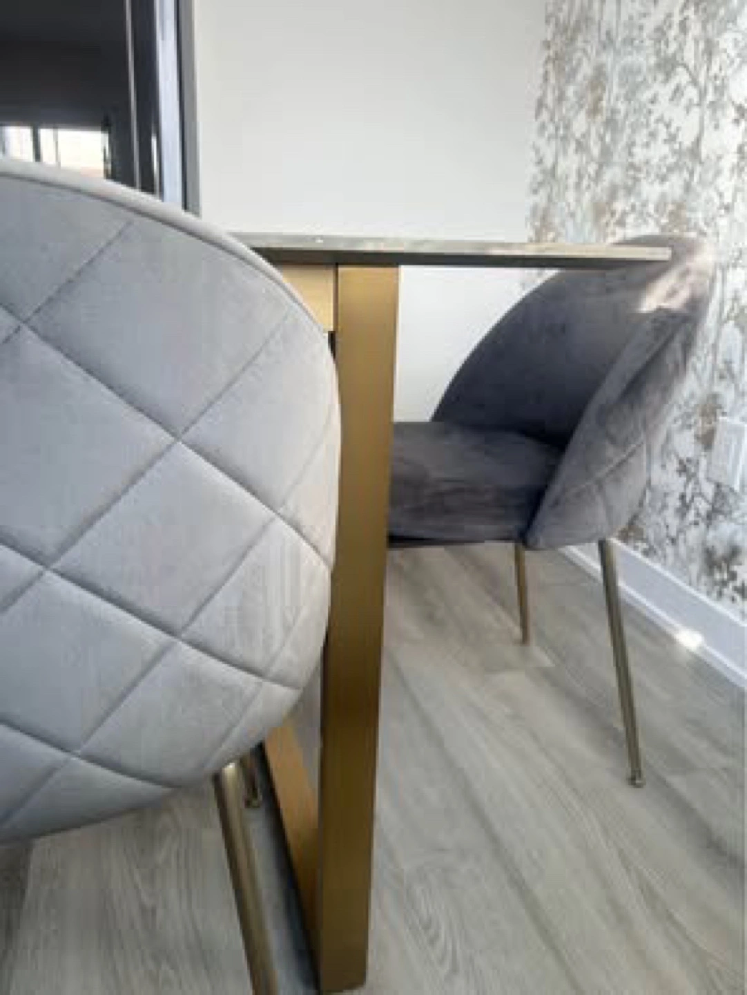 Elegant dining table set. Features a large rectangular table with a marble-look top and gold metal legs. Six grey velvet chairs included. Stylish and contemporary design. Perfect for a modern home. From Structube they retail over $1000 brand new