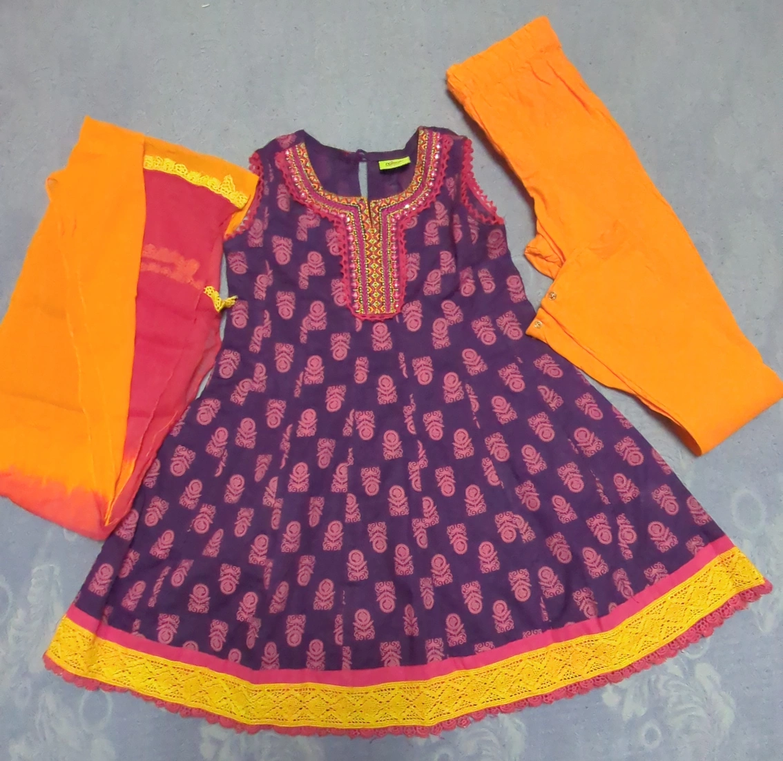 Beautiful girls' three-piece Indian churidar. Purple cotton kurta with pink and orange embroidery. Matching orange churidar pyjamas and dupatta. Size 3-4 years.