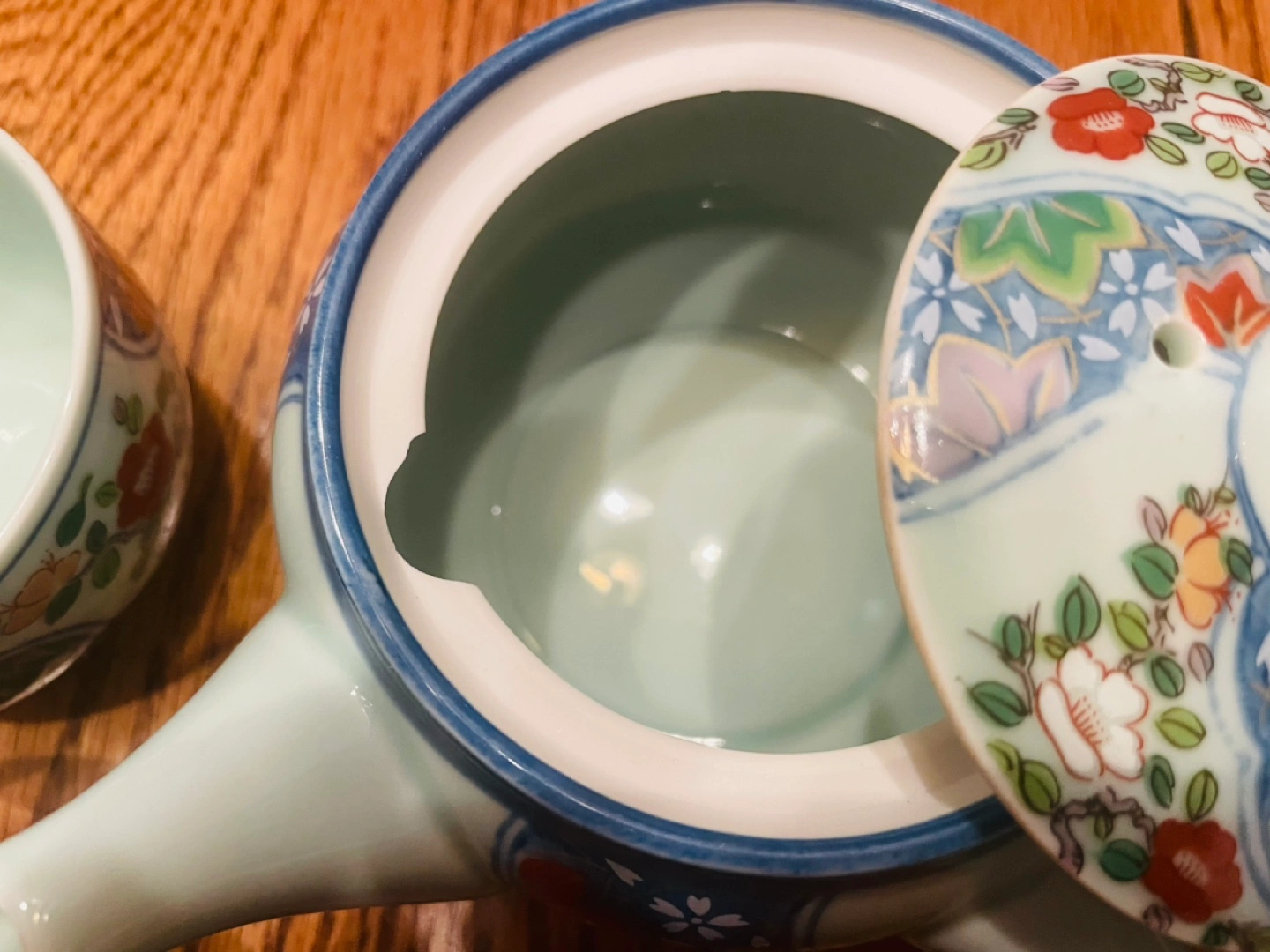 Beautiful vintage Japanese tea set. Features a teapot with an integrated infuser and four matching teacups. Floral design. Pale green colour. Great for tea ceremonies or everyday use.